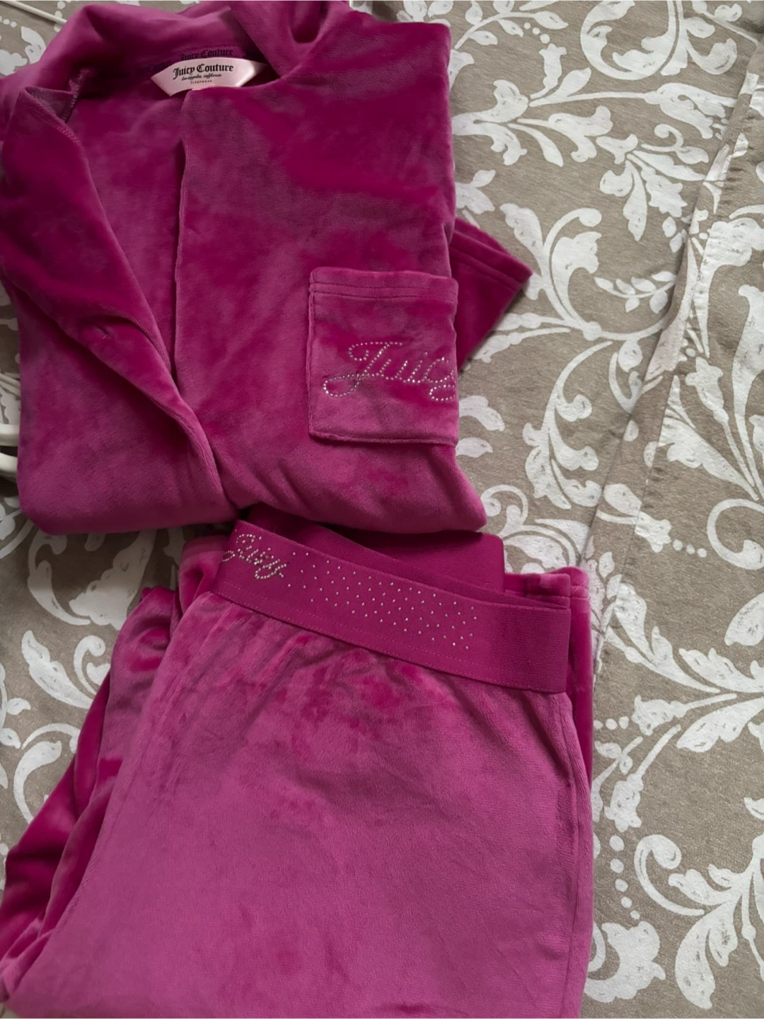 Never used , brand new Cozy pink velour pyjama set from Juicy Couture. Features sparkly 'Juicy' logo detailing on the pocket and waistband. Velour material for ultimate comfort. Perfect for lounging!
