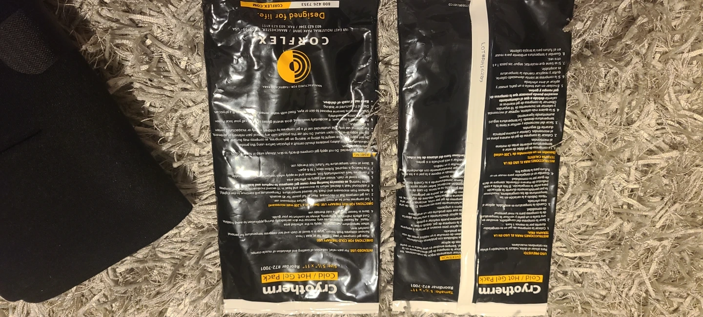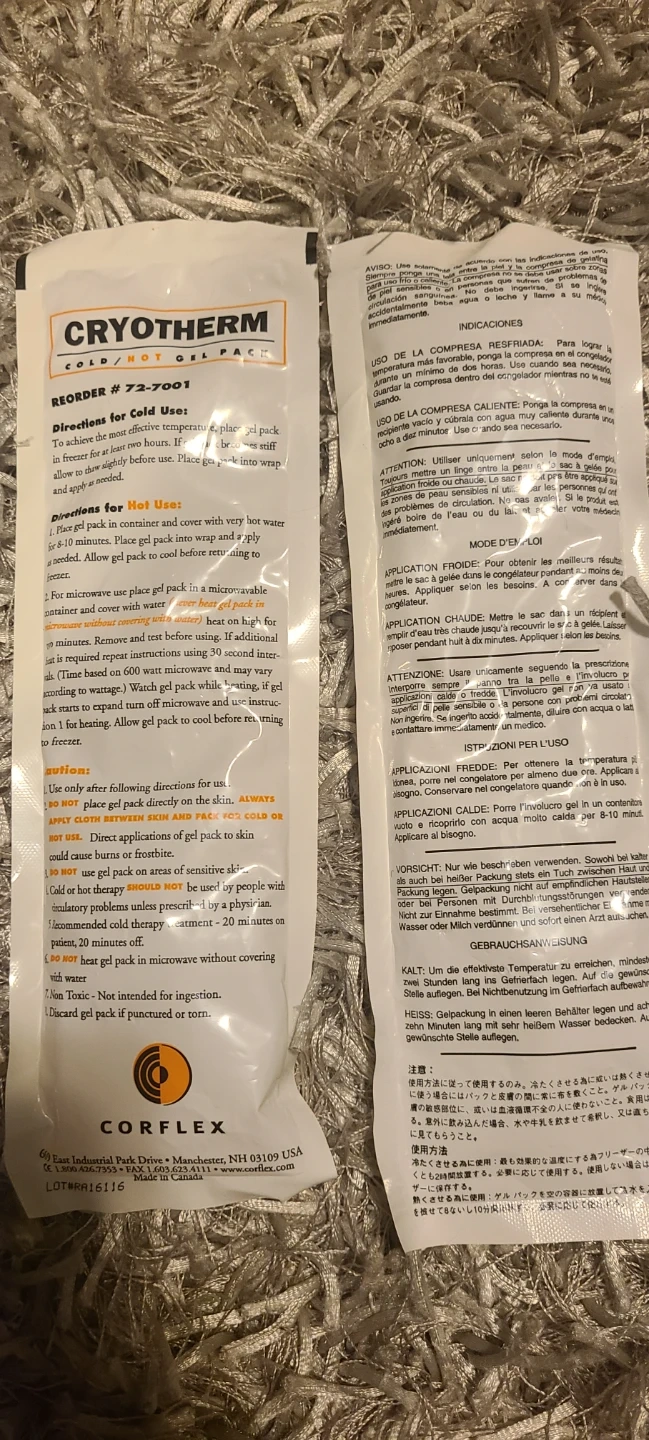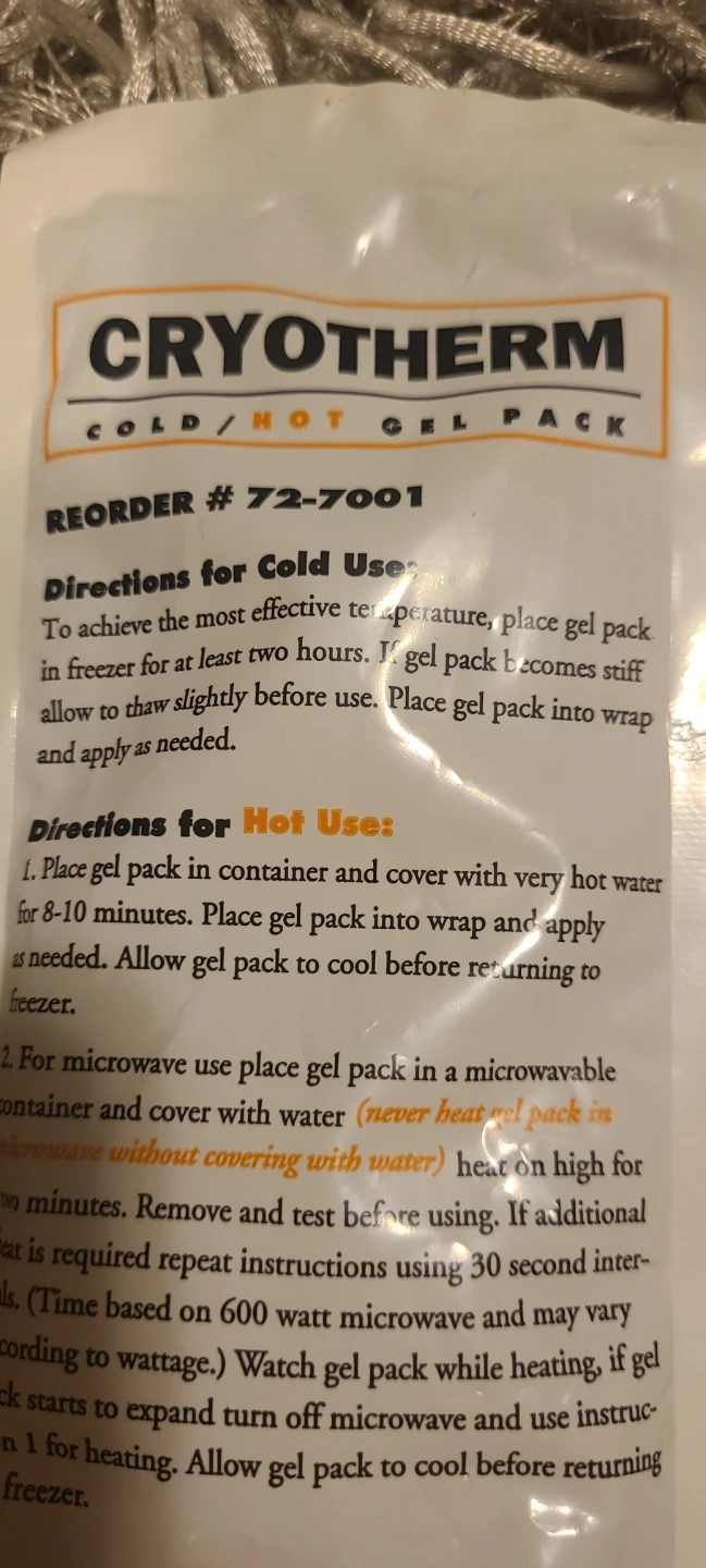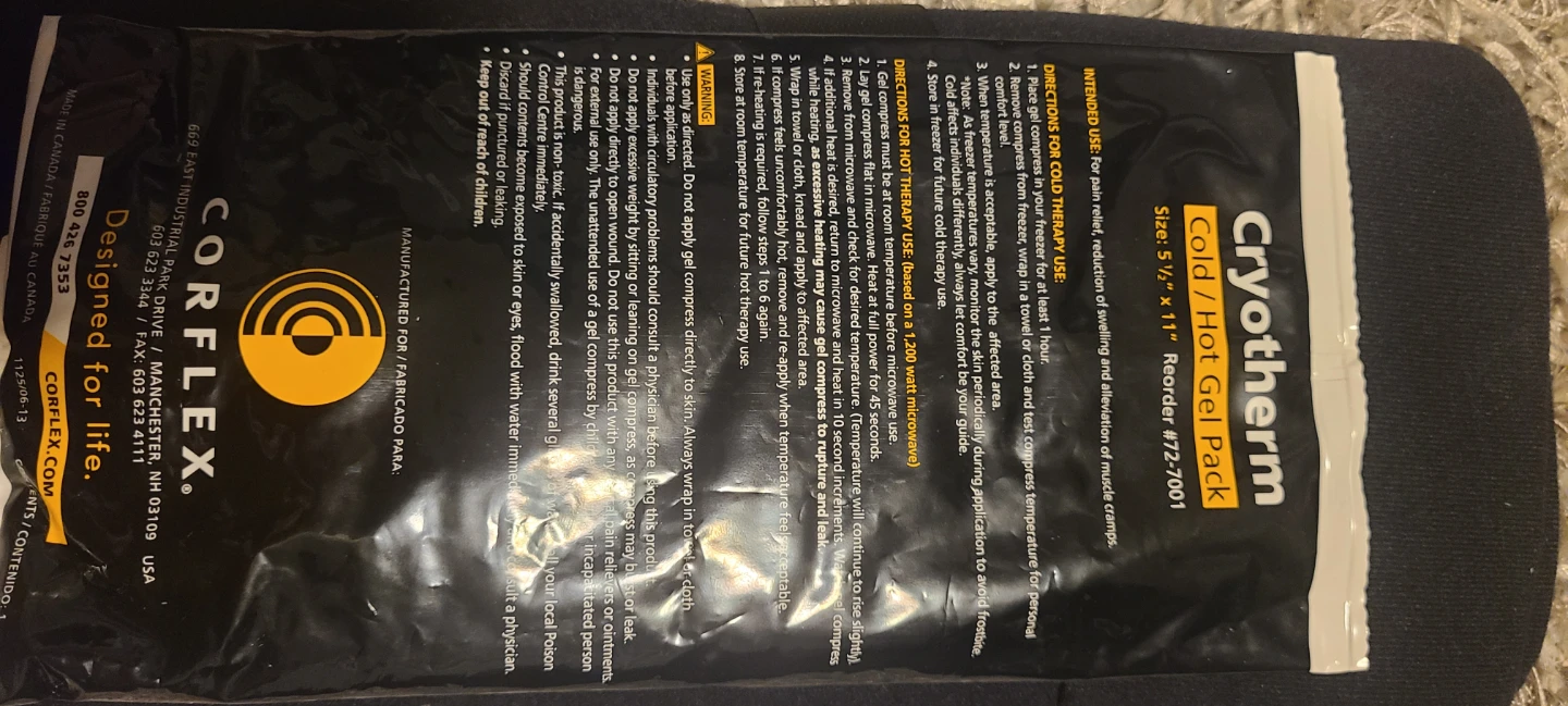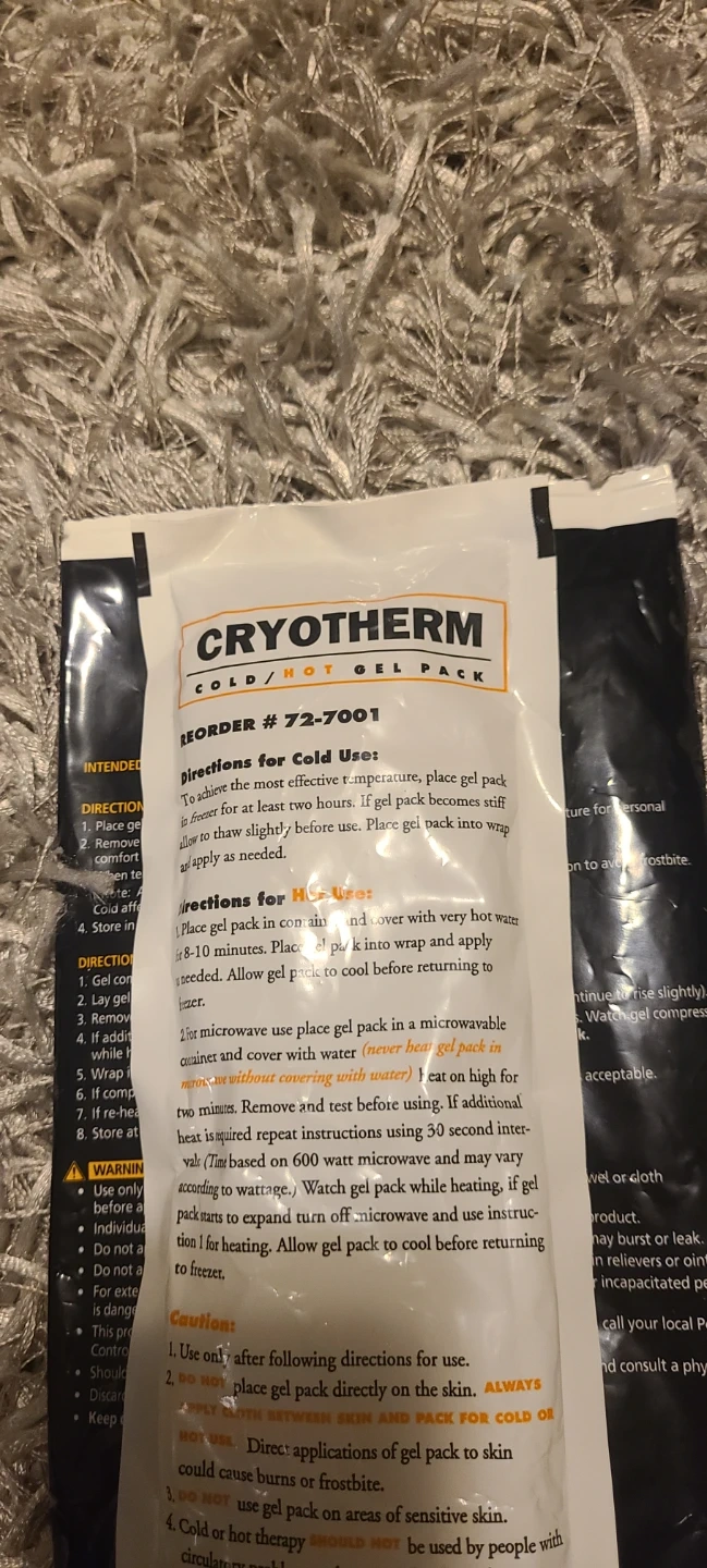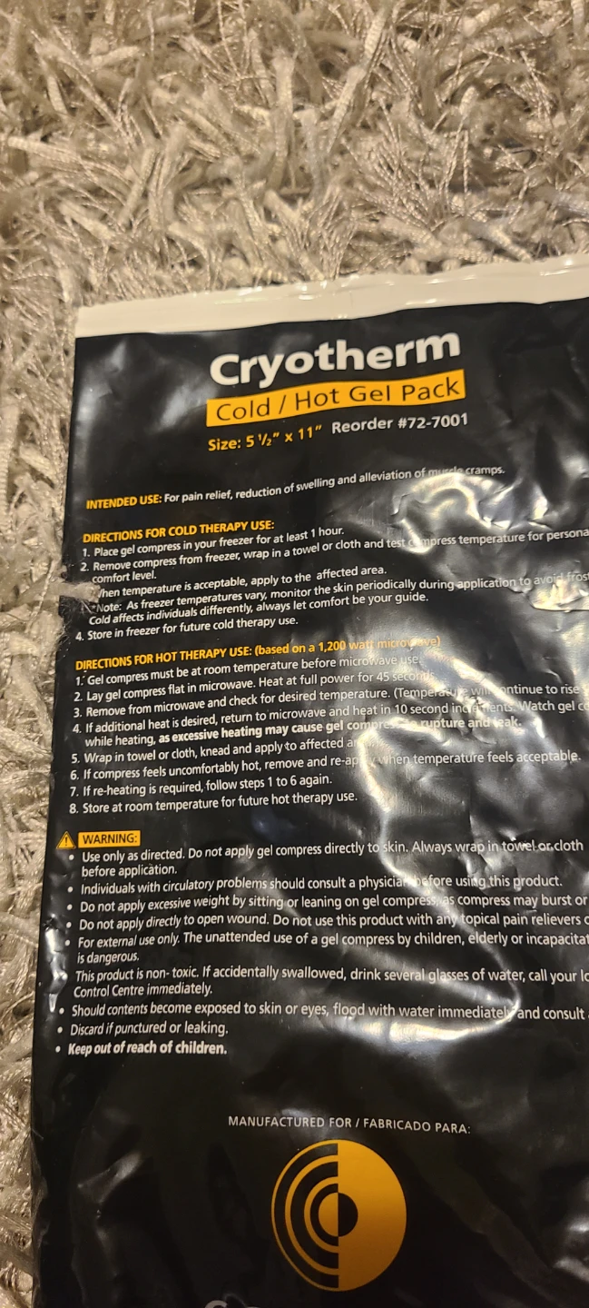 CryoTherm cold/hot gel pack for pain relief, swelling, and muscle clamps. Size is 5 1/2" x 11". Designed for life. Includes original packaging.