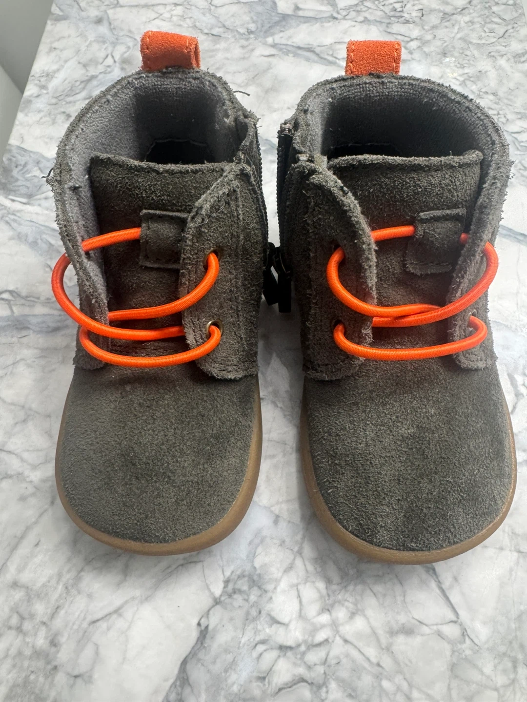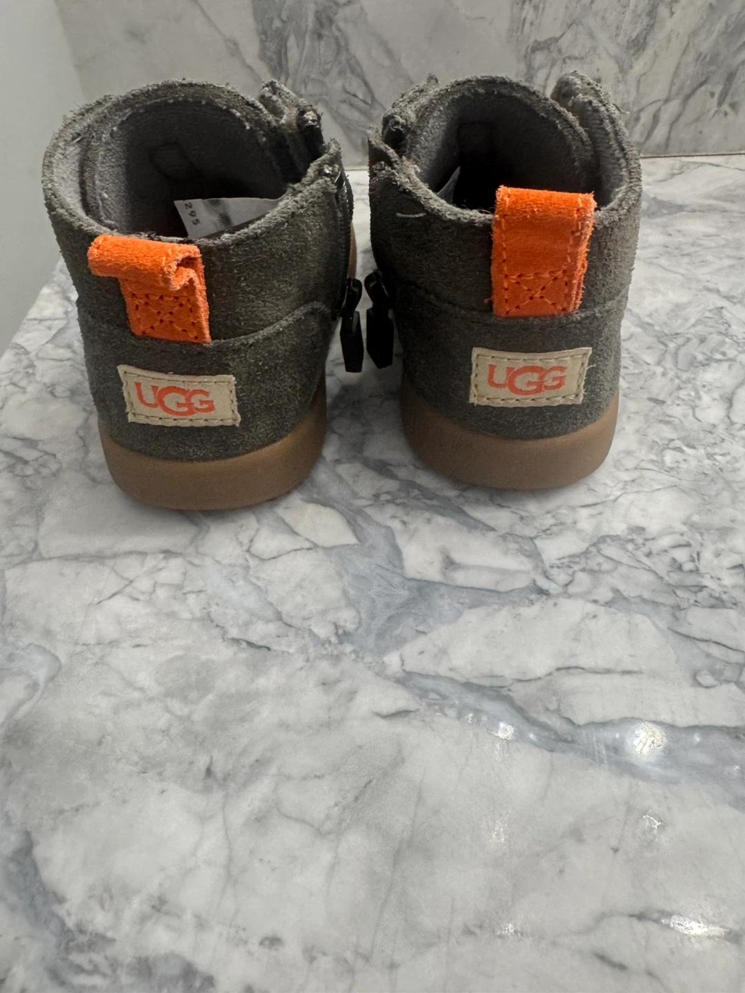 These UGG boots are grey suede with orange accents. They feature a side zipper and elastic laces for easy on and off. The soles have UGG branding. Perfect for toddlers transitioning to walking!