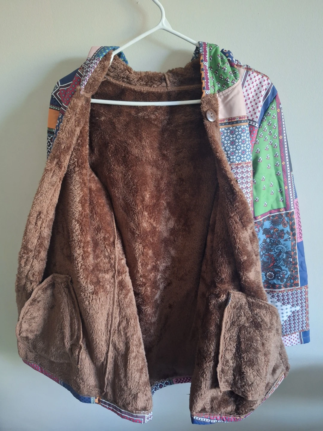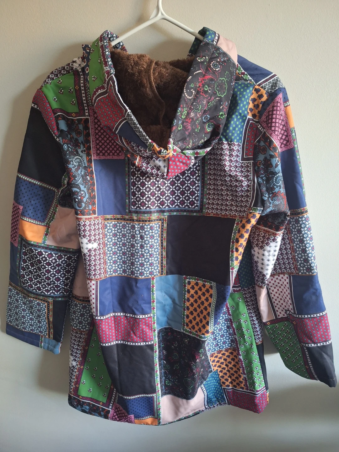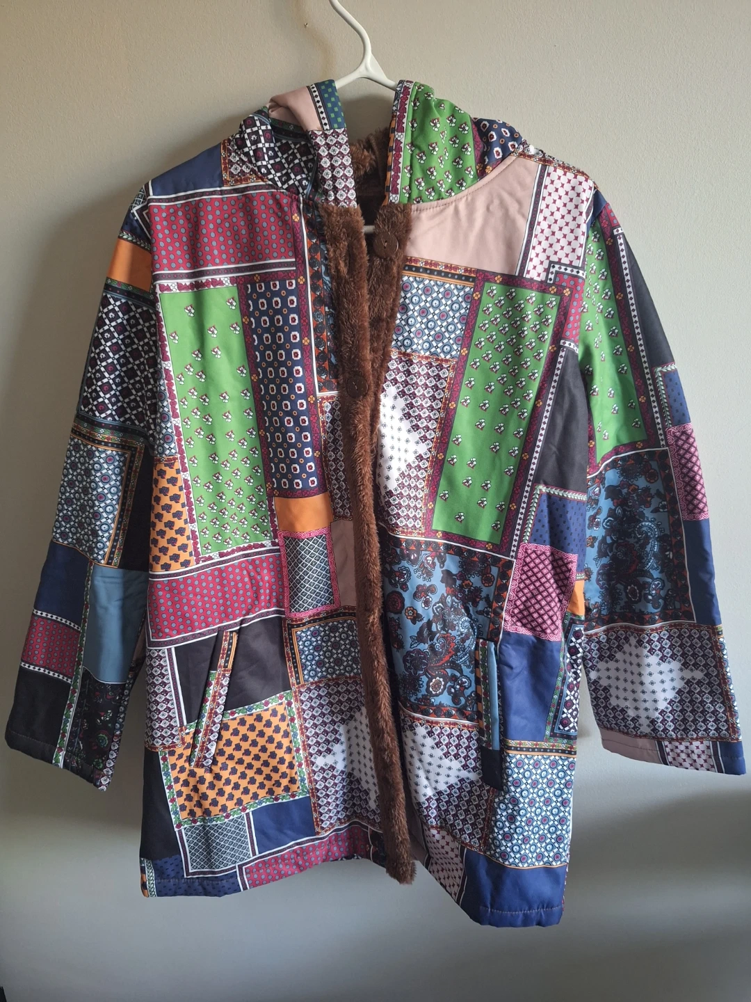 Quirky hooded jacket featuring a colourful patchwork design. It's lined with soft brown faux fur for extra warmth. Two front pockets included. Cute and comfortable. They fit a little tight, so if you want to wear layers with it, I'd suggest getting a size larger.