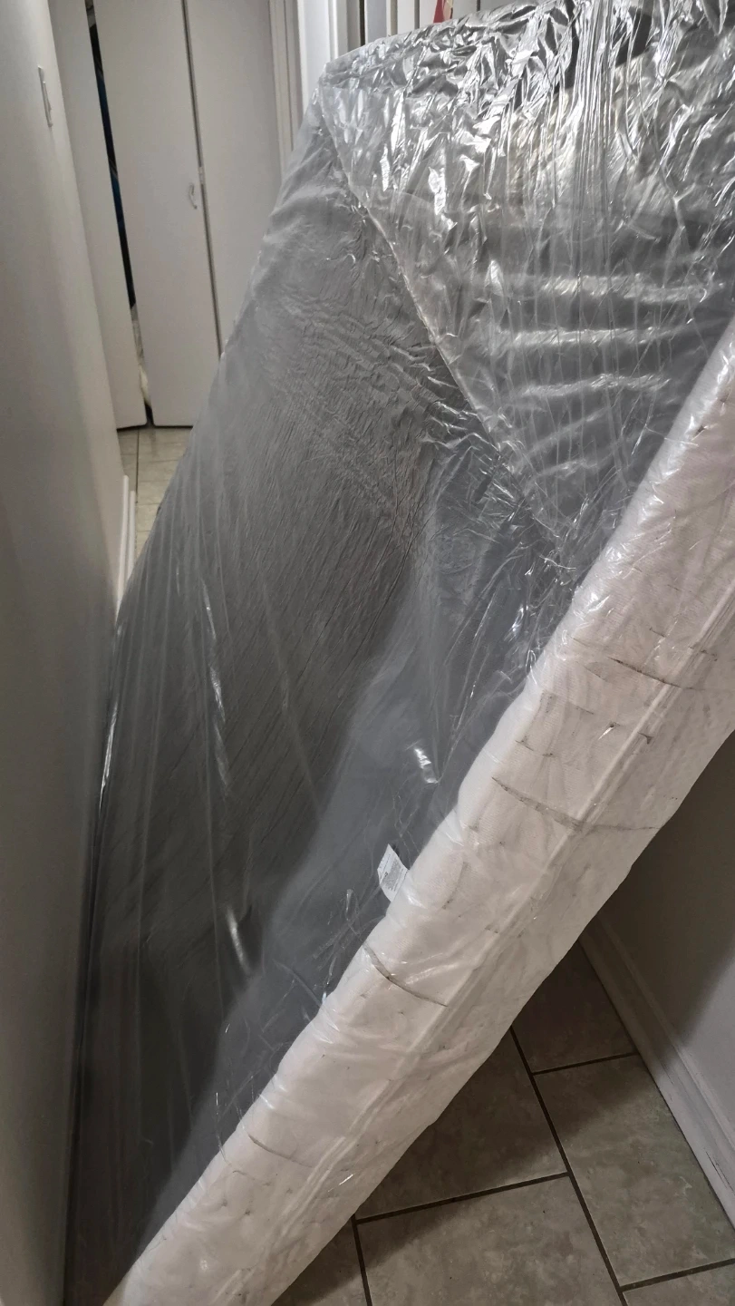 This is an IKEA mattress, still in its original plastic wrapping. It's a clean white mattress that is ready for a new home. This mattress would be useful for anyone setting up a new bedroom or replacing an old mattress.