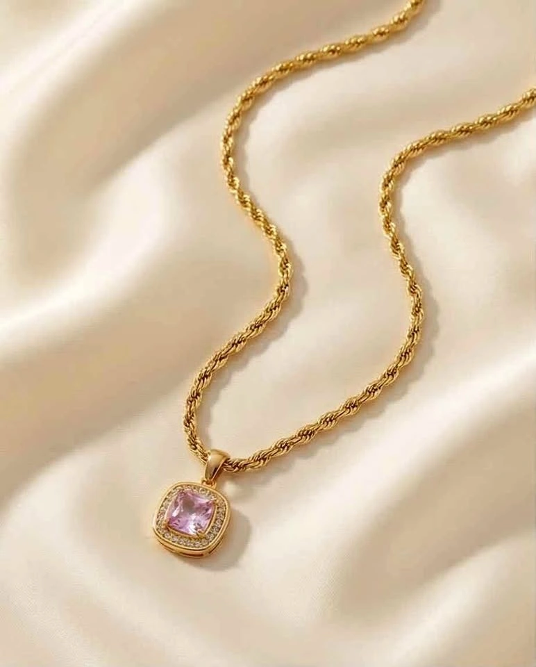 Elegant 18K gold-plated stainless steel necklace featuring a beautiful pink zircon stone pendant with a delicate rope chain design. This piece is durable and tarnish-resistant, perfect for everyday wear or special occasions. A stylish and minimal accessory that also makes a lovely gift.