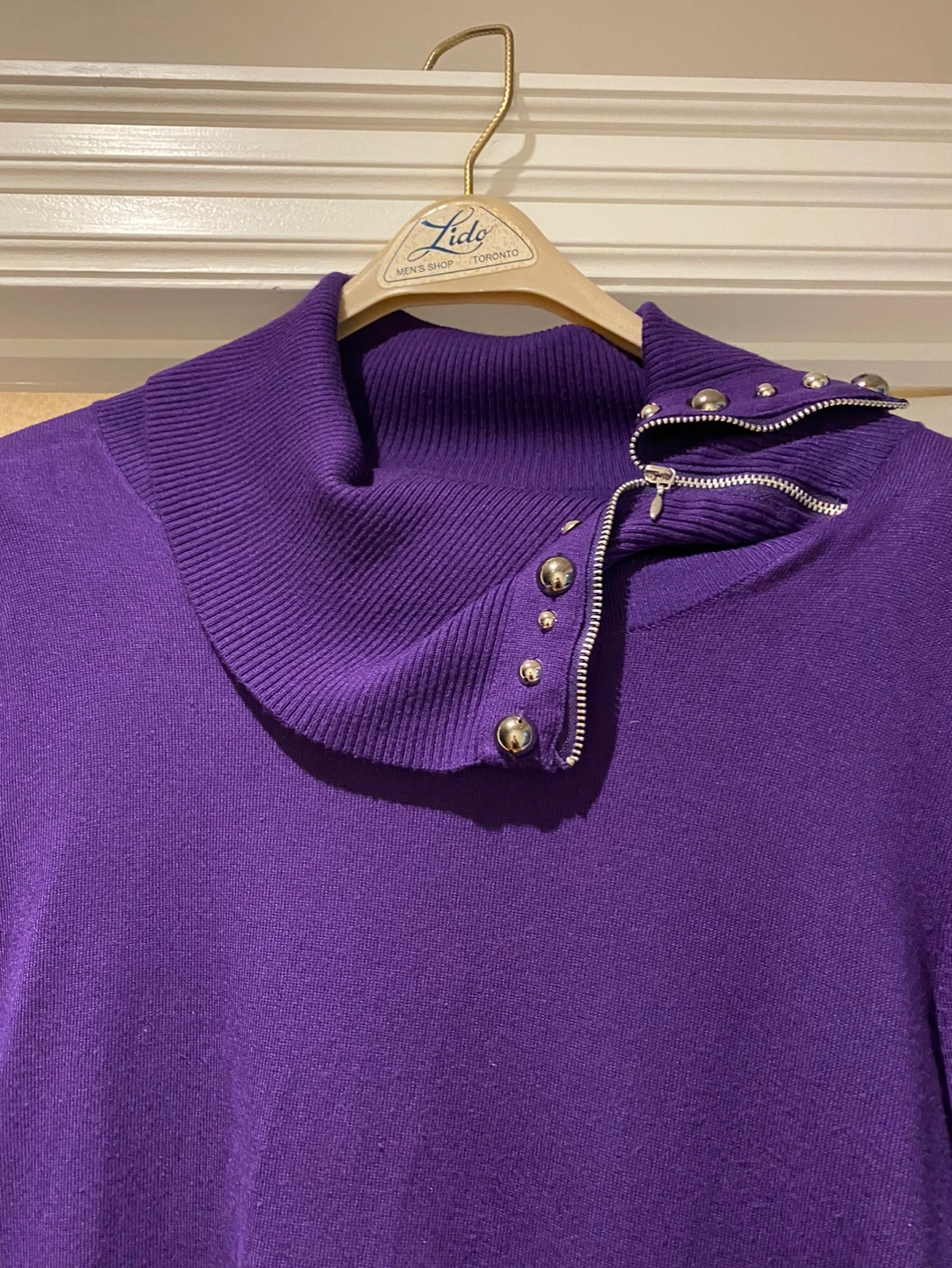 Good quality and in excellent condition Long-sleeved purple sweater with a cowl neck, zipper detail, and metal accents on the shoulders and cuffs.