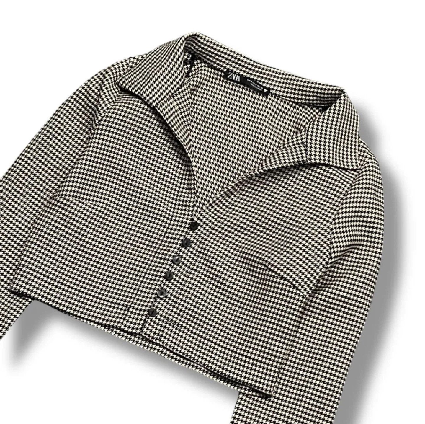 Zara blazer with a classic houndstooth pattern. It features a button-up front and a tailored fit. Looks sharp with trousers or jeans!