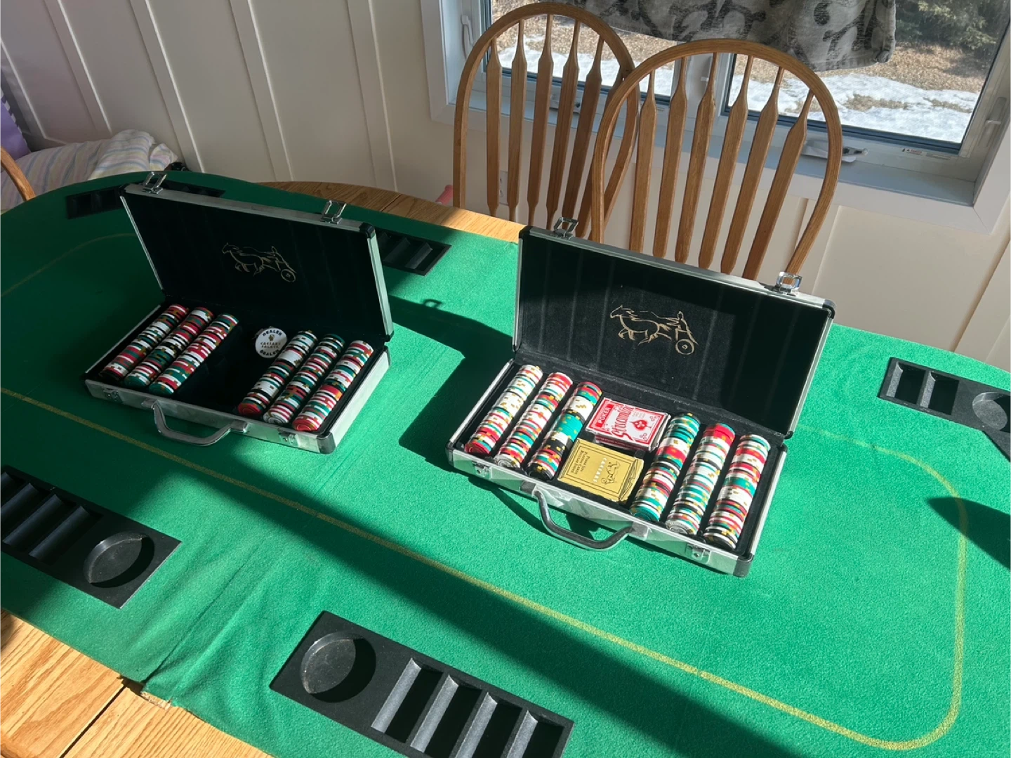36”w x 79”L table top poker set with chips. Seats 8 comfortably.