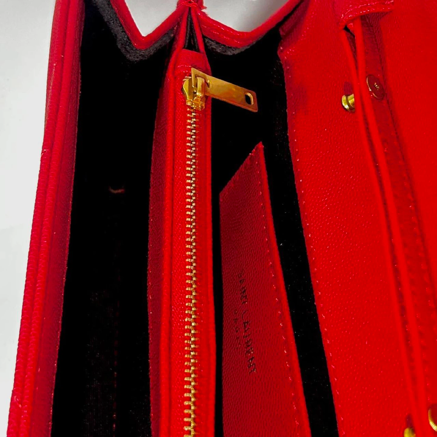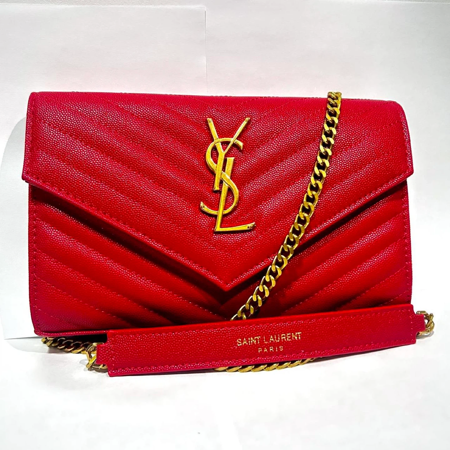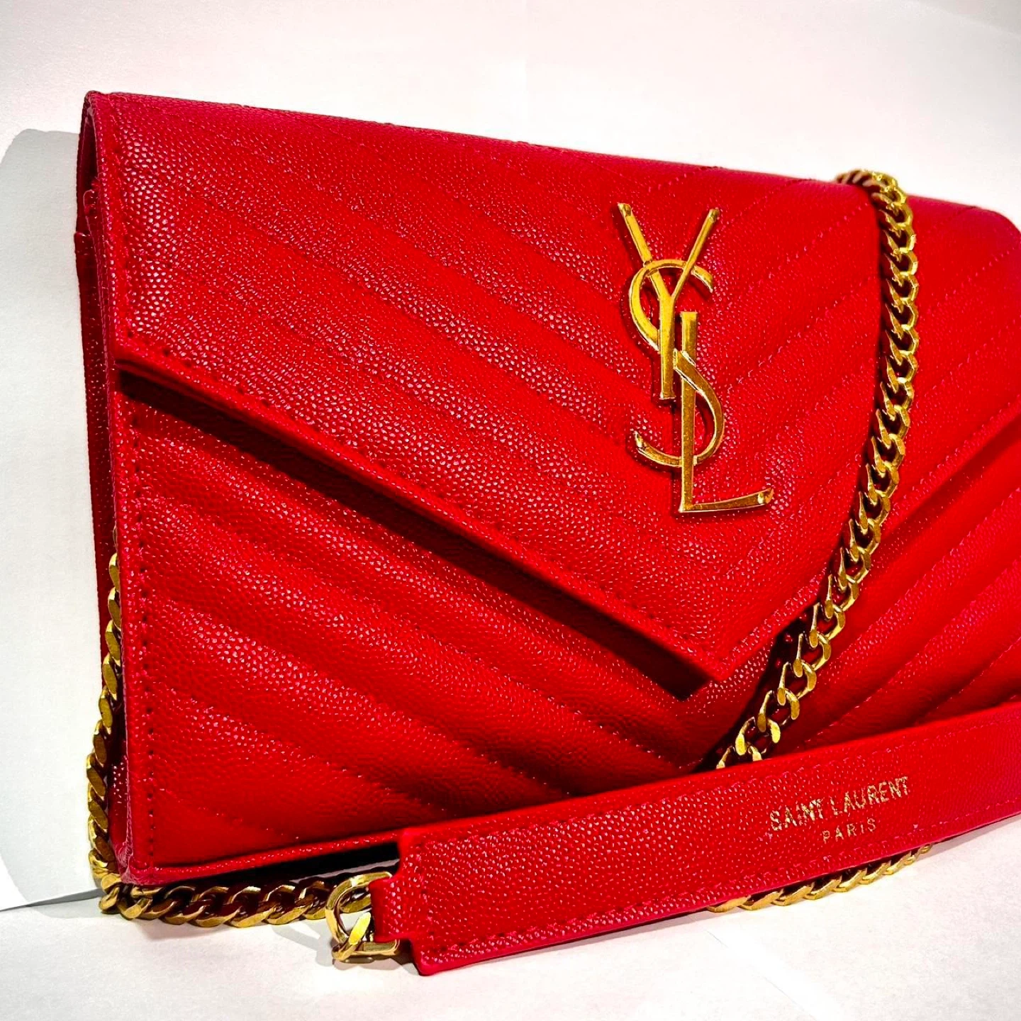 A vibrant red chevron leather wallet on chain by Saint Laurent. It's crafted with pebbled leather and features a signature gold-tone YSL logo. The interior includes a zippered pocket.