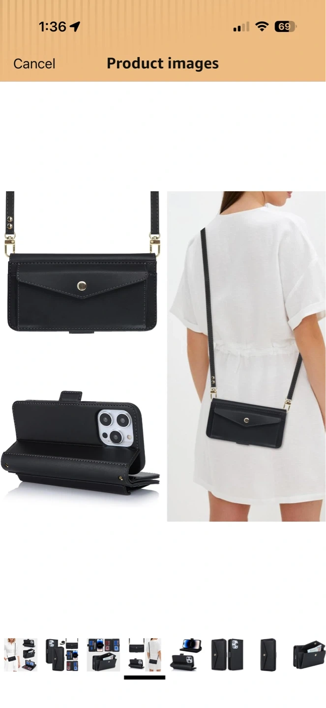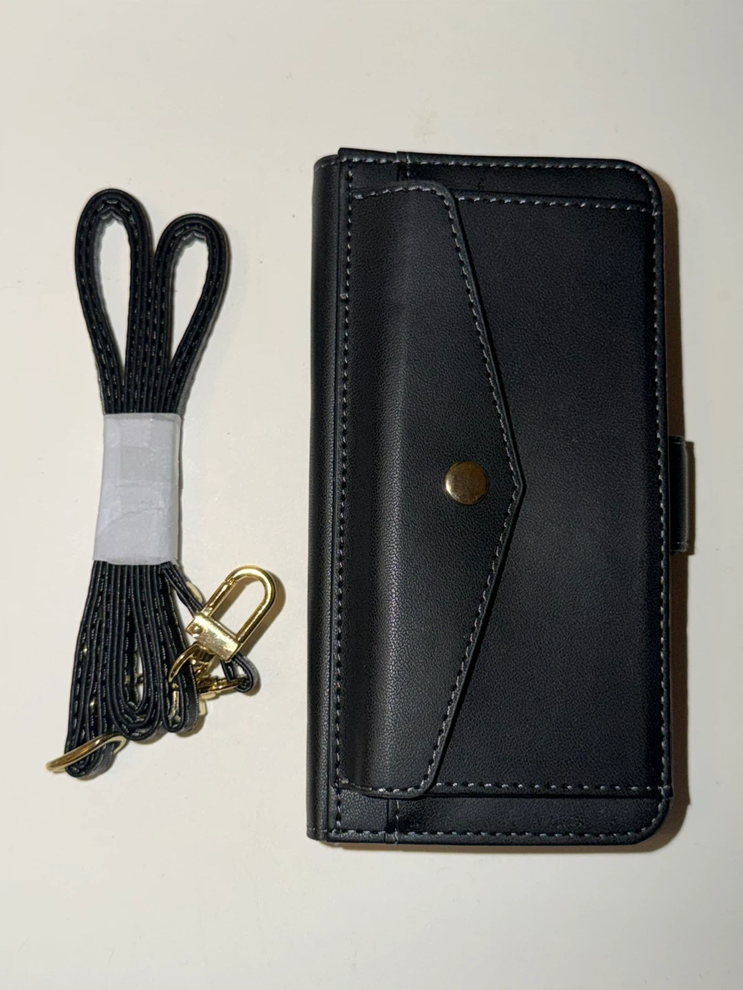 Black leather wallet phone case with multiple card slots and a button snap closure. It also includes a detachable lanyard for easy carrying. This case offers protection and convenience for your phone.