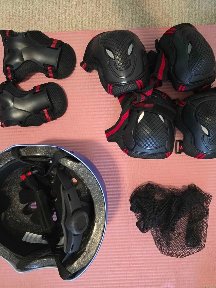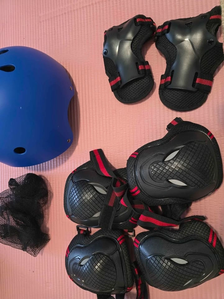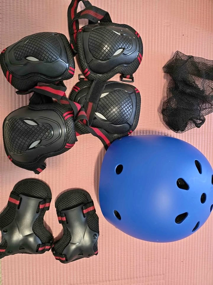 Complete protective gear set with a blue helmet, black knee pads, elbow pads, and wrist guards with red stripes. Good for biking, skating, or scootering. Comes with a mesh storage bag.