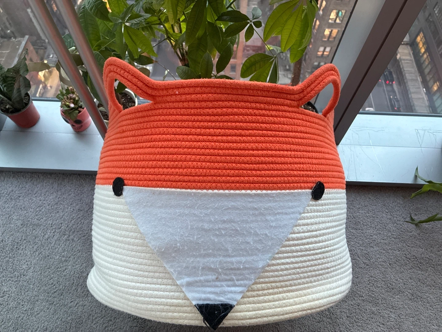 Selling a Cute fox-themed storage basket! It’s orange and white and perfect for organizing toys, laundry, and many more items. There are normal signs of use inside and outside of the basket as seen in pictures.