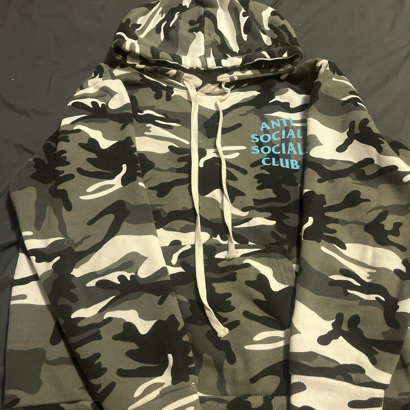 This is an Anti Social Social Club hoodie in size medium. It's made with 80% cotton and 20% polyester. This hoodie features a classic camouflage pattern. It's great for casual wear!