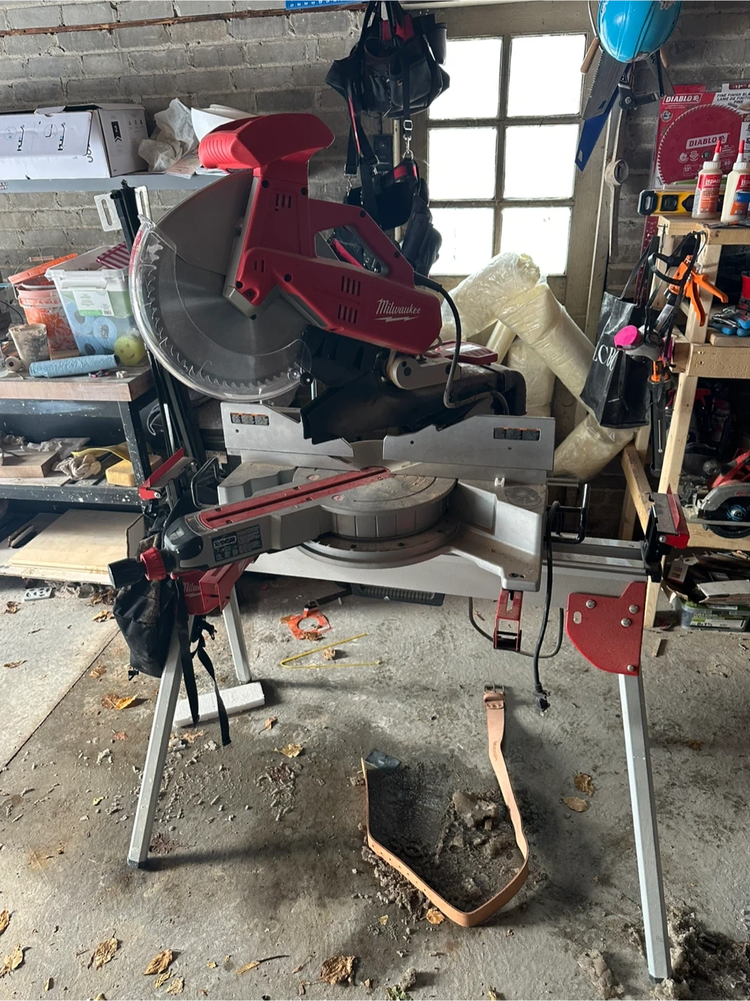This is a Milwaukee corded miter saw. It comes with a Diablo 12" 80-tooth fine finish blade. The saw is red and silver and includes its stand. Barely used!