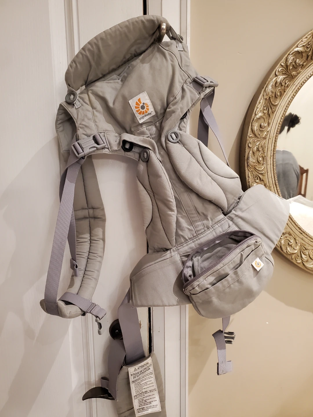 This is an Ergobaby baby carrier in a neutral grey colour. It's designed for comfort and support for both parent and baby. Adjustable straps ensure a snug fit for various body types. Newborns can be carried with this as well. No insert required to carry a newborn.