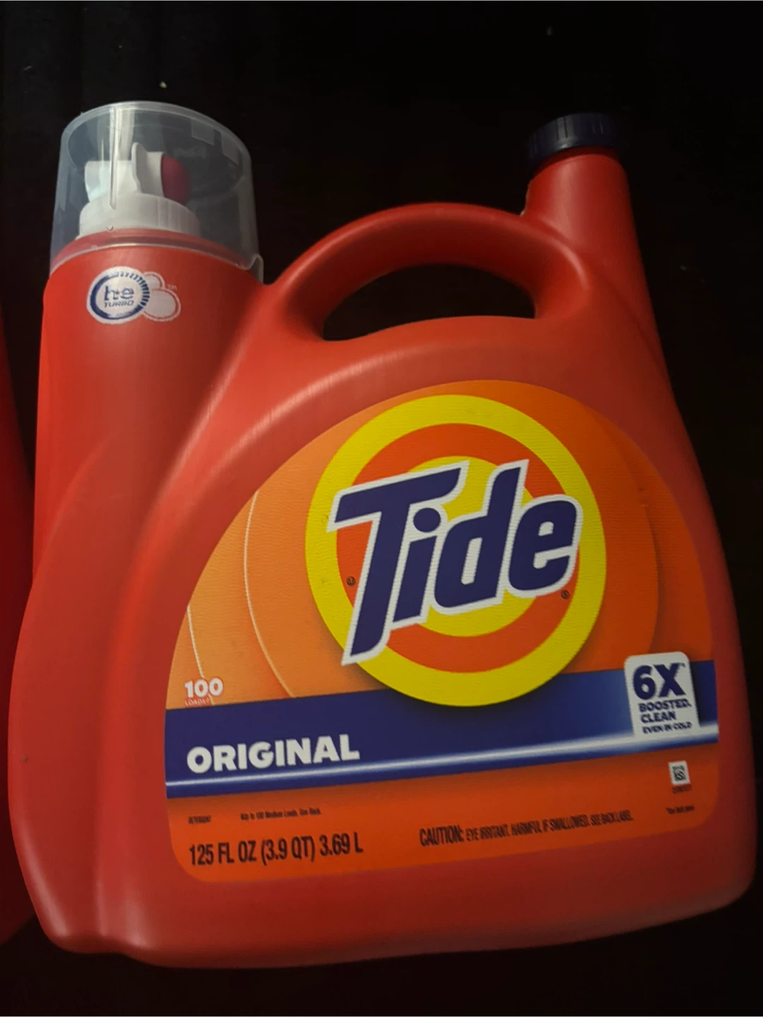 This is a large bottle of Tide Original liquid laundry detergent. It's a 125 fl oz container, which is equivalent to 3.9 quarts or 3.69 liters. The formula offers 6X boosted clean, even in cold water, and is suitable for 100 loads.