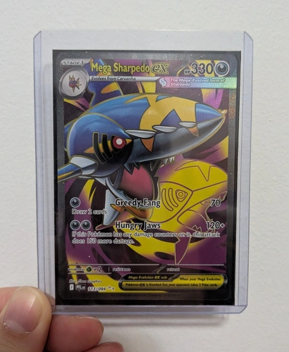Unleash the power of the Mega Sharpedo ex, a formidable addition to any Pokémon TCG collection. With its Ultra Rare status, this card is a must-have for enthusiasts seeking to enhance their gameplay or collectors looking for a standout piece. The card features the enigmatic Sharpedo in its Mega Evolution form, bringing a new level of strategy to battles. The Mega Sharpedo ex 113/094 comes from the captivating Phantasmal Flames set. Feel free to message if you have any questions!