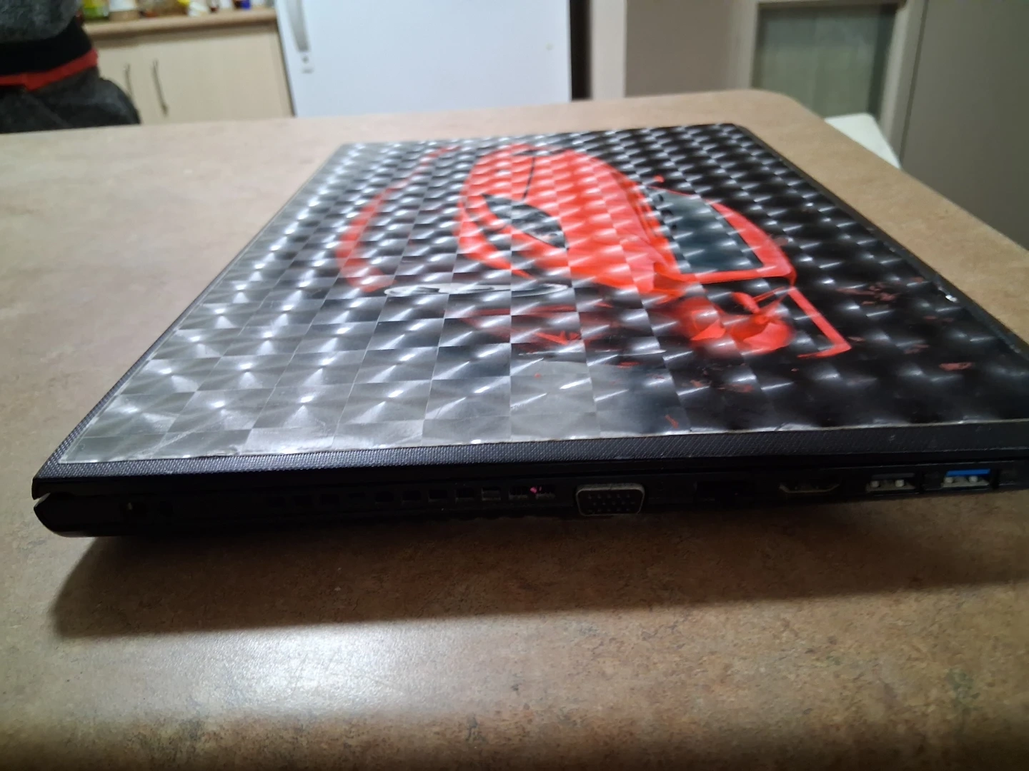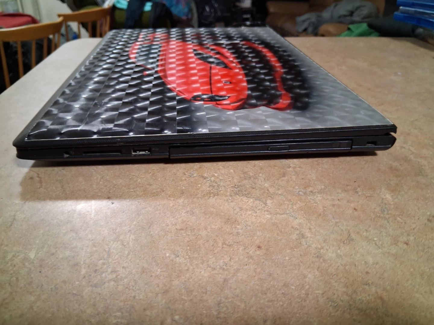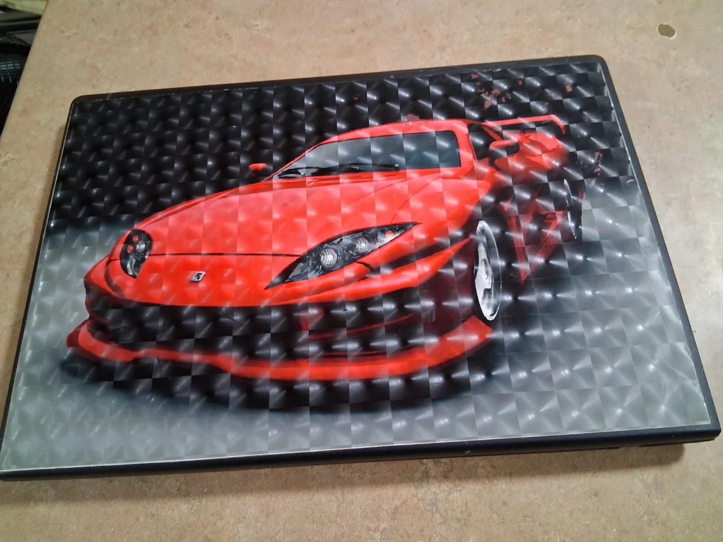This Lenovo laptop has a unique red sports car graphic on the lid. It's a black laptop with a standard QWERTY keyboard layout. Perfect for everyday tasks! As it is