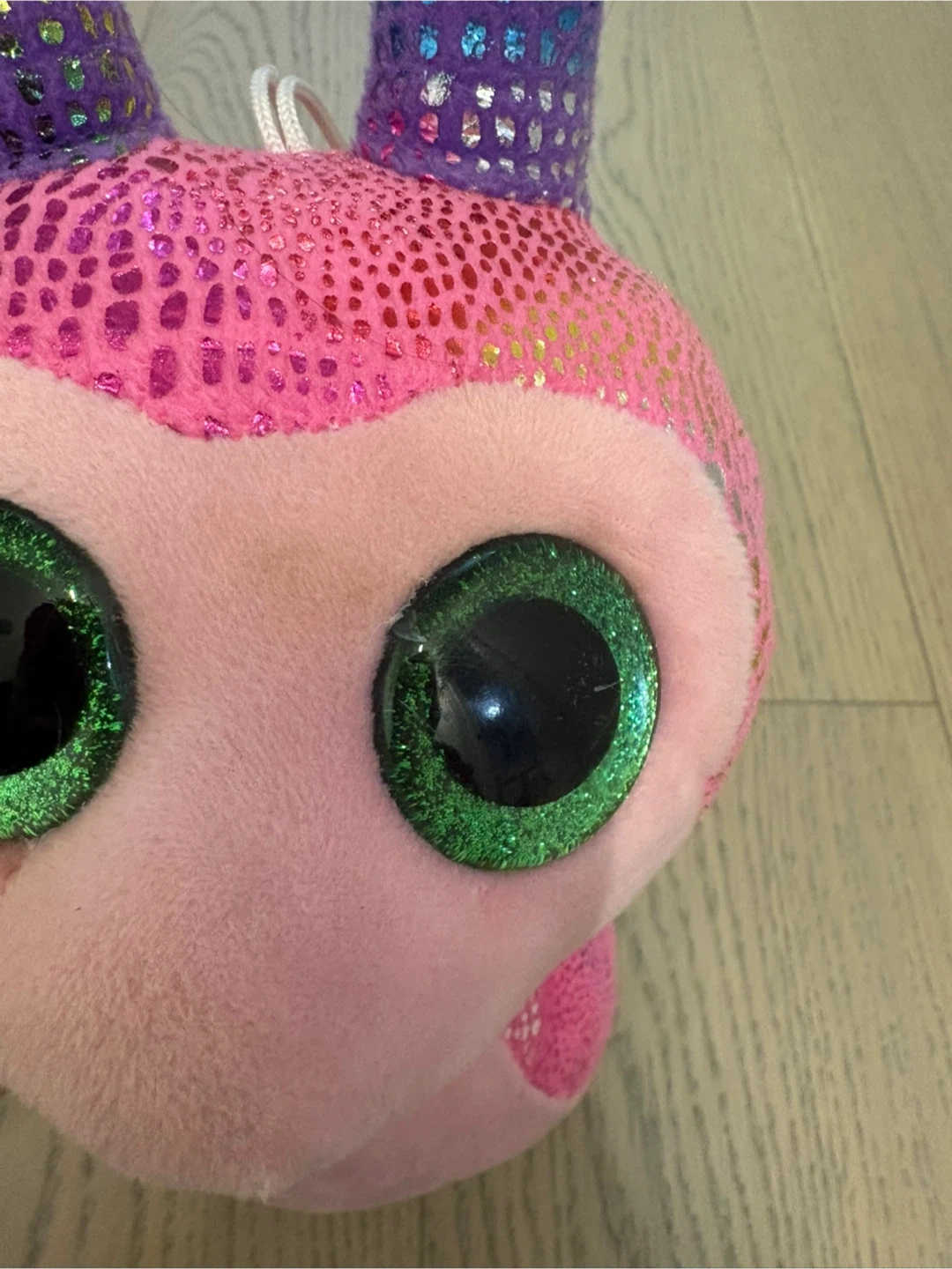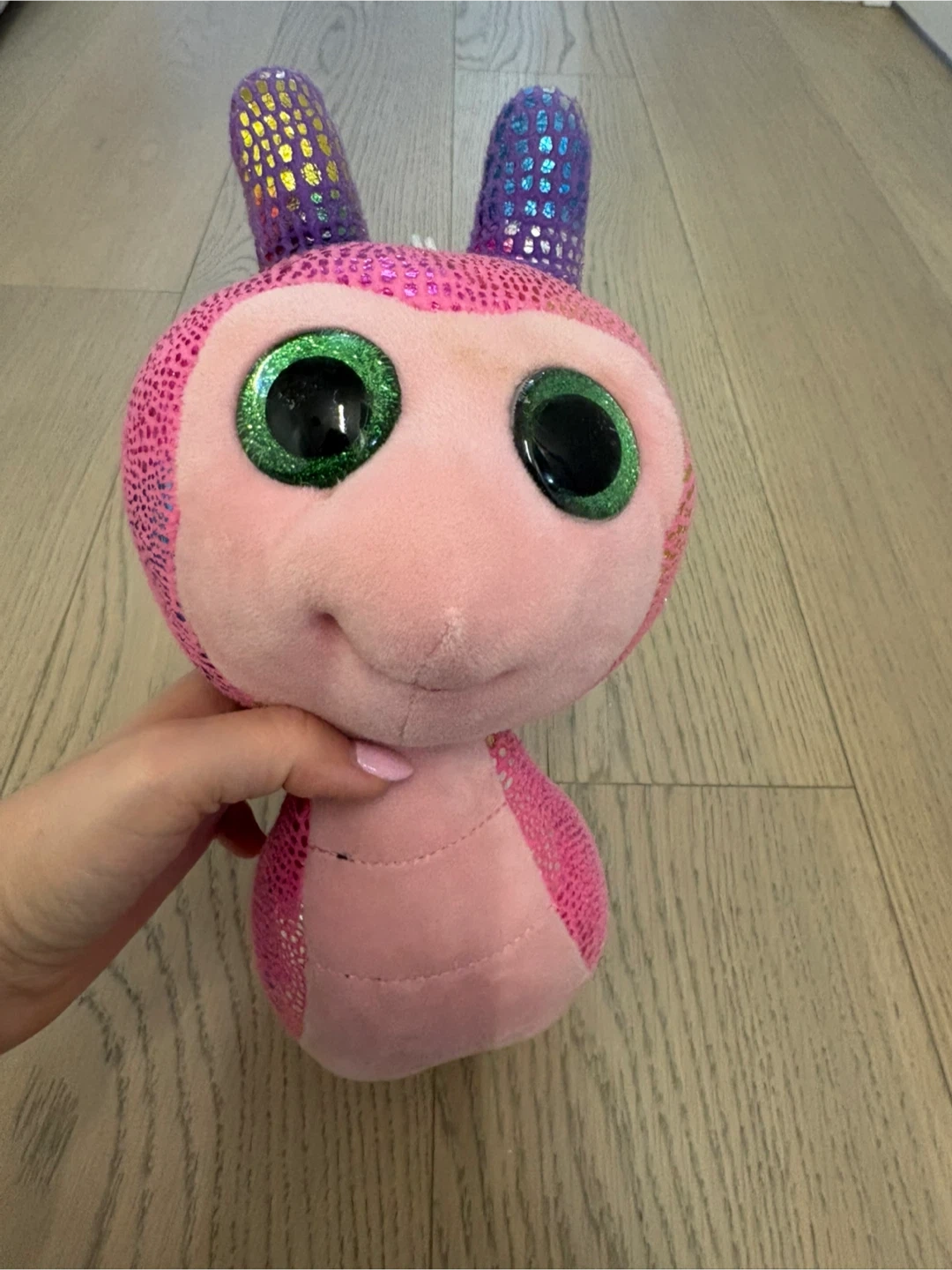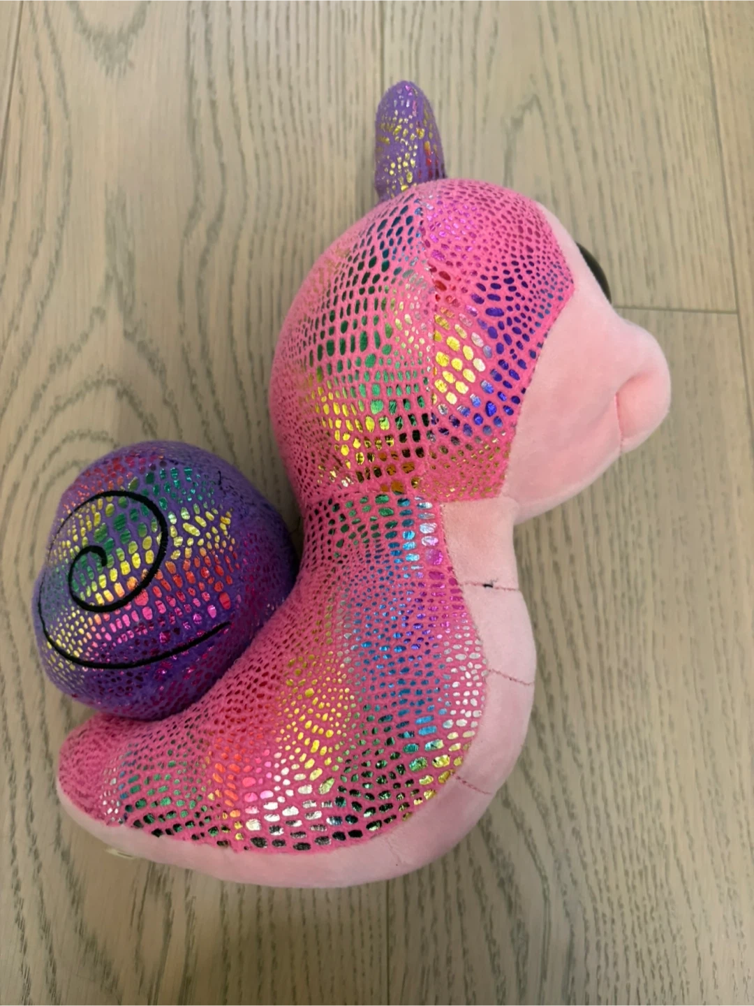 This is a cute pink plush toy shaped like a snail. It features sparkly fabric details on its shell and body, with big green glittery eyes. Perfect for playtime or as a colourful decoration! Small stain near eyes as shown in photo #3.