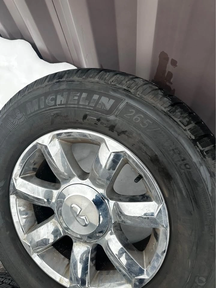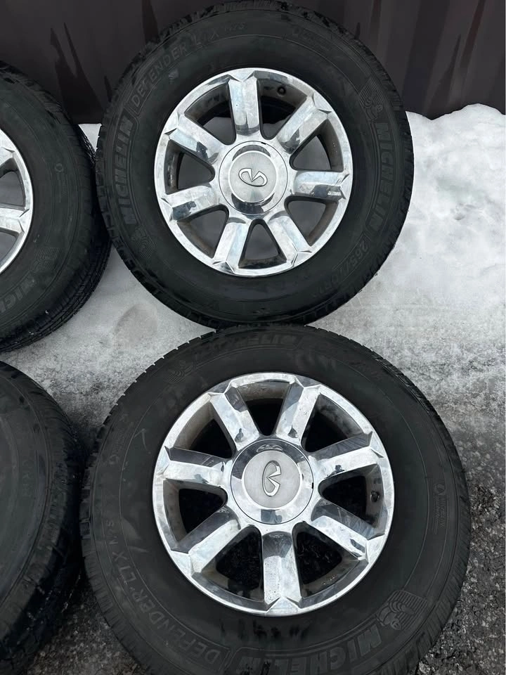 Set of original 18-inch rims from a Nissan or Infiniti QX80/QX56/Armada, fitted with Michelin Defender tires. These came off a 2004-2007 Infiniti QX56. The bolt pattern is 6x139.7. TPMS sensors are included. Tire size is 265/70R18. Asking $899 for the set. All prices are subject to HST. We accept credit, debit, e transfer, & cash! Pickup is in Oakville. Feel free to message if you have any questions!