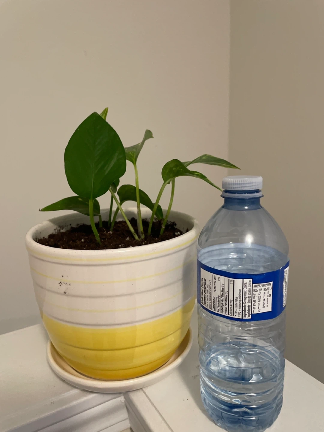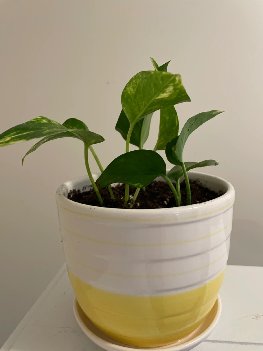 A healthy Pothos plant in a ceramic yellow and white pot with a saucer. It's a lovely addition to any indoor space. This plant is known for its easy-care nature and air-purifying qualities.