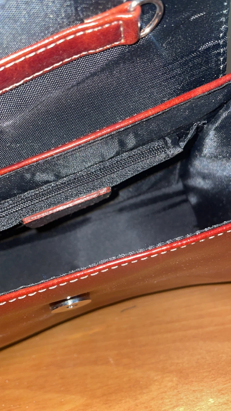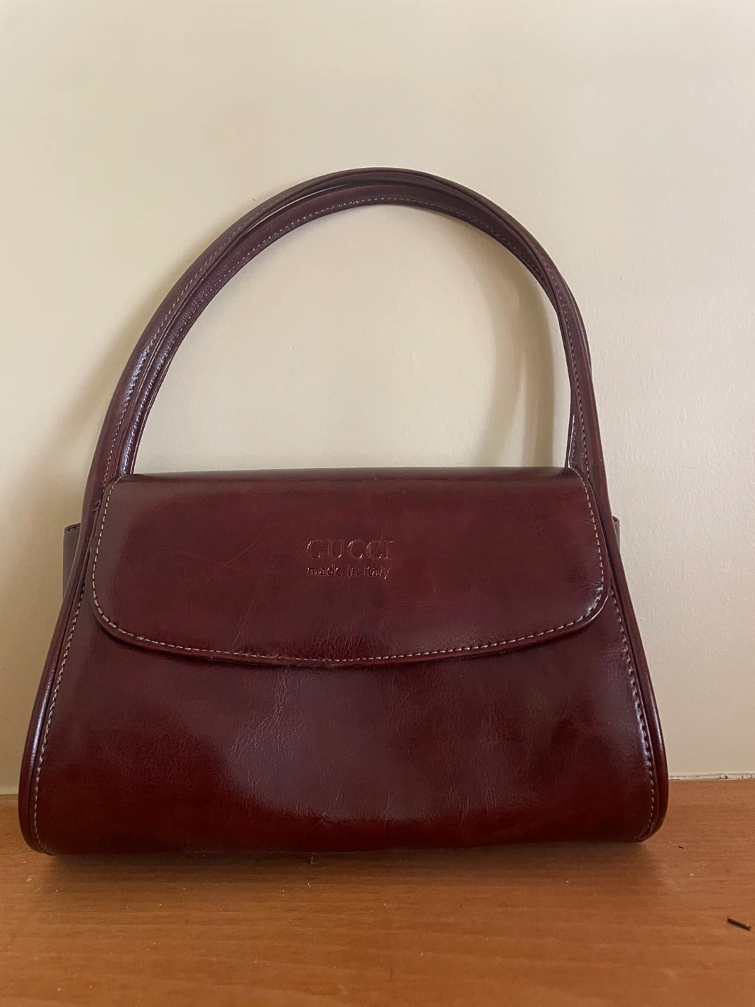 A stylish Gucci shoulder bag in a deep burgundy colour. It's made from smooth, glossy leather and features a classic flap closure with a subtle embossed logo. The interior is lined and includes a zippered pocket. This bag is perfect for everyday use or for a night out!