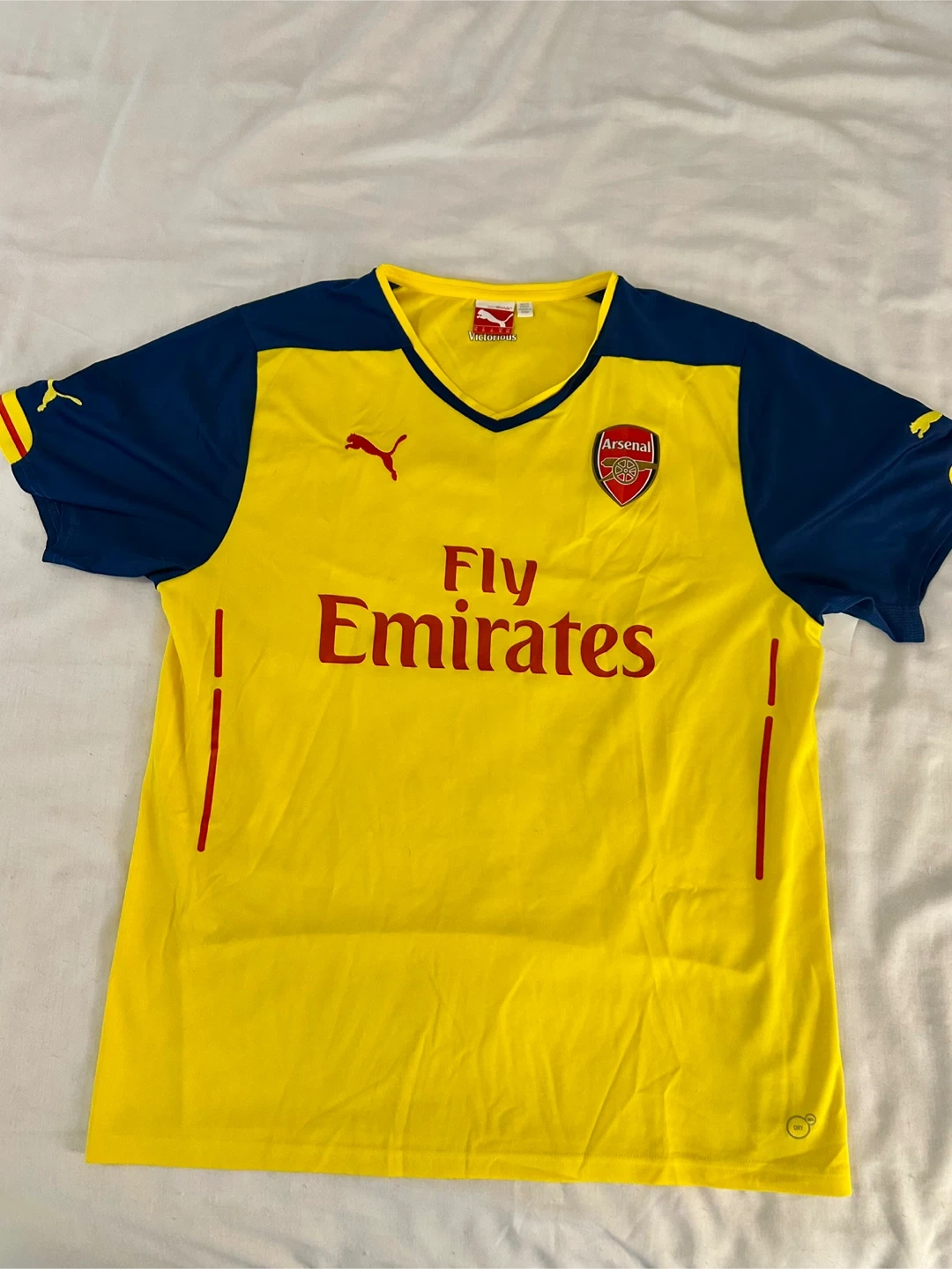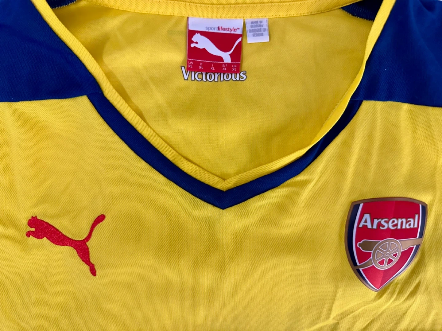 Yellow short-sleeve Puma football jersey for Arsenal FC. It's a size XL with the 'Fly Emirates' sponsor. Made in Georgia.