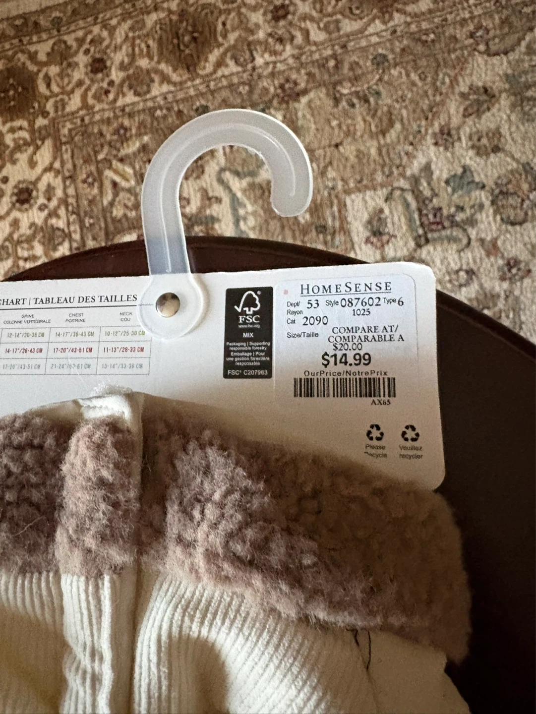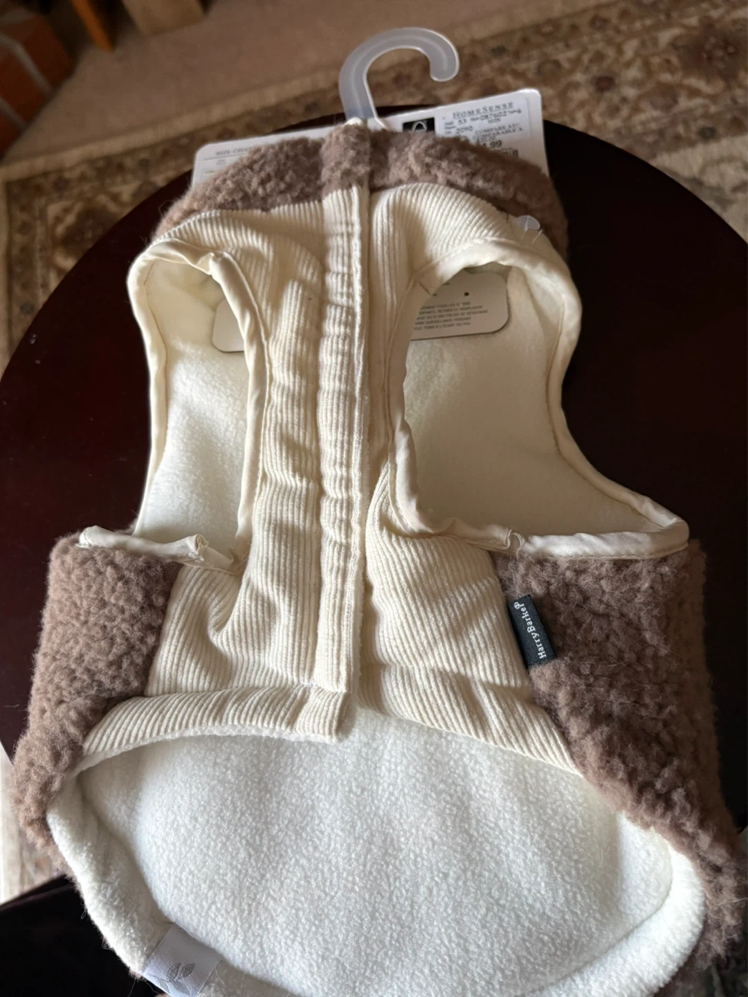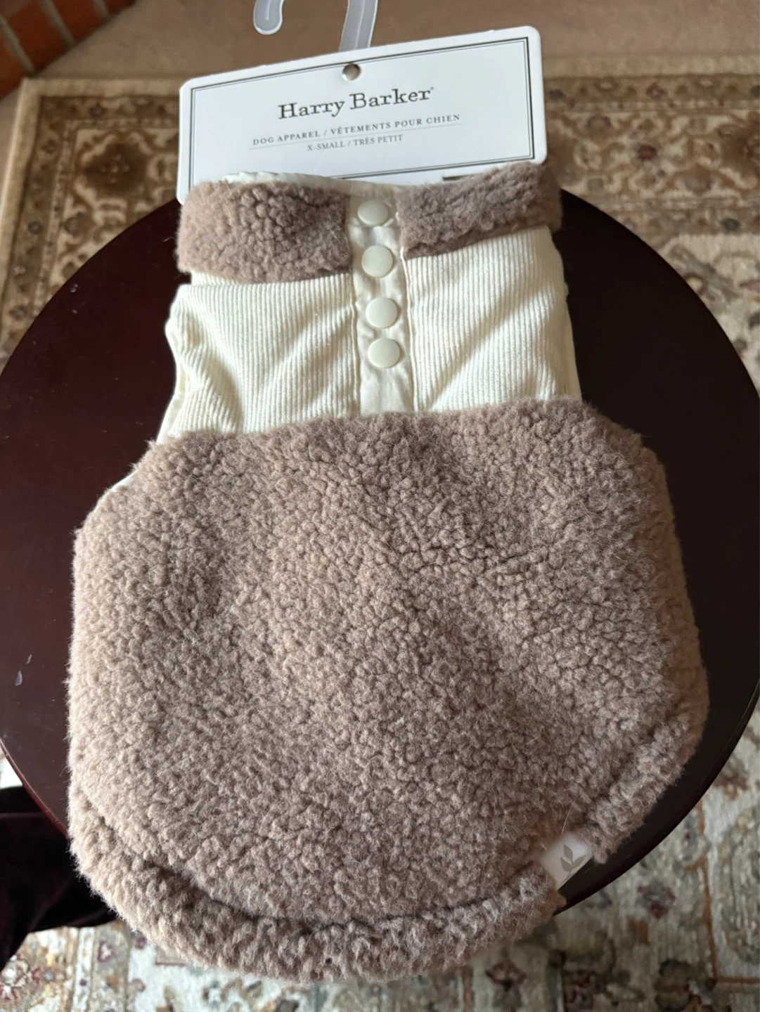 Cozy Harry Barker dog vest in cream and brown. It's X-Small with a soft fleece lining and corduroy outer. Features a button-up front for easy dressing. This is a great piece for keeping your furry friend warm!