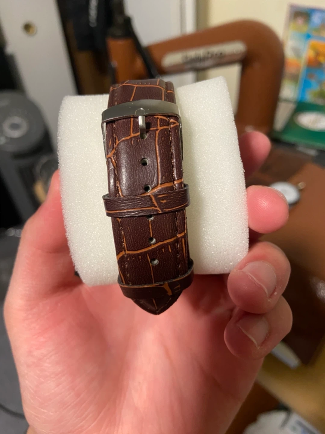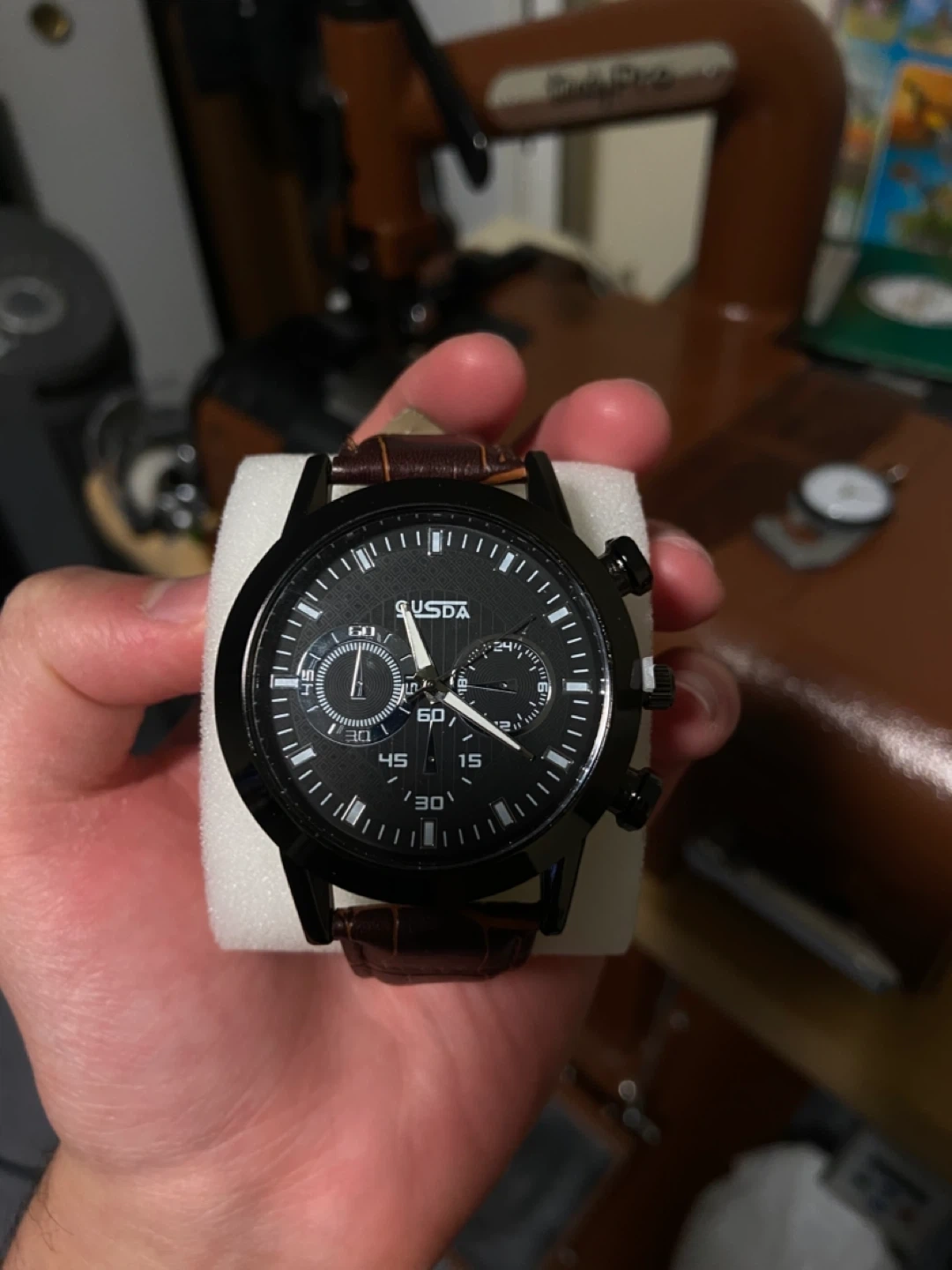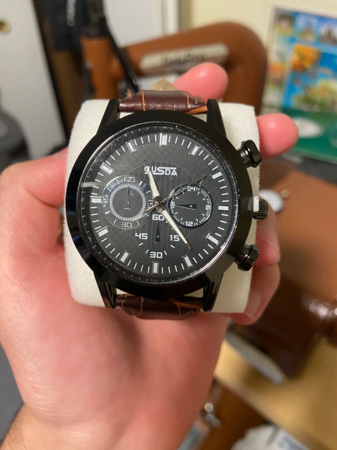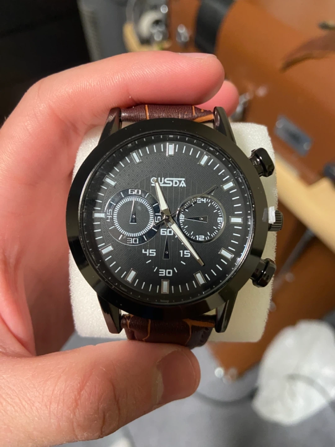 Selling a Qusda men's watch with a black face and a brown leather band. It's in great condition and ready for a new owner!