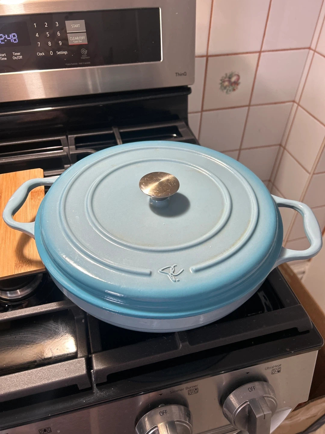 PC signature round Dutch oven in a light blue colour. It's made of cast iron and includes the lid with a gold knob. It's great for braising, roasting, and stews.