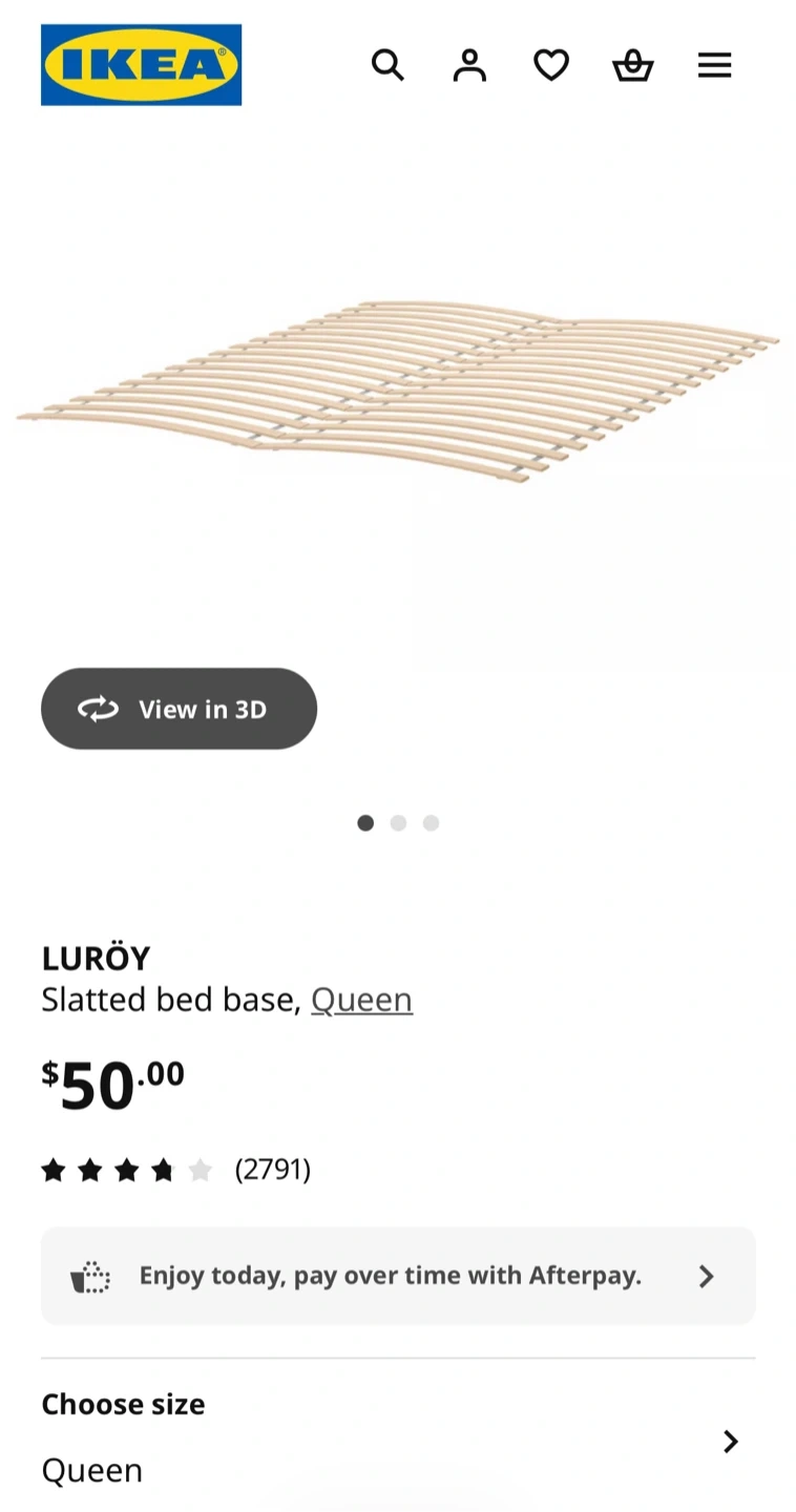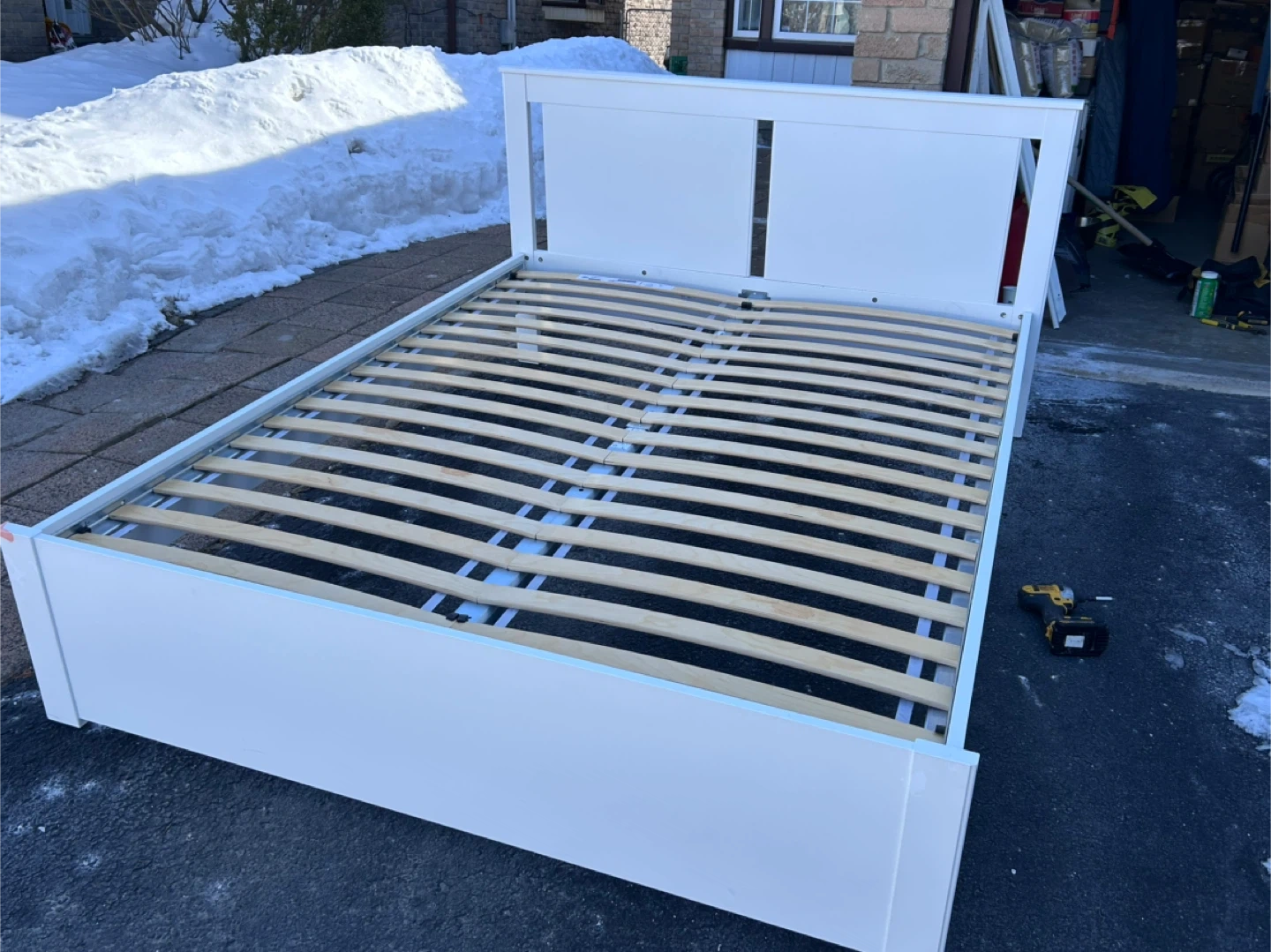 This is a white IKEA SONGESAND Queen bed frame. It includes the Luröy slatted bed base and a SKORVA center support beam. And comes with a queen mattress.