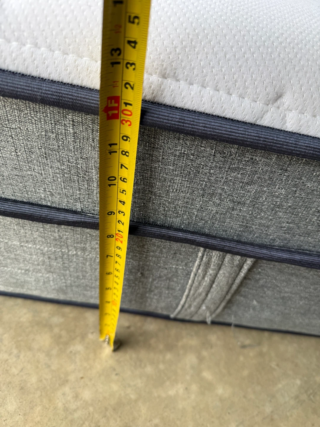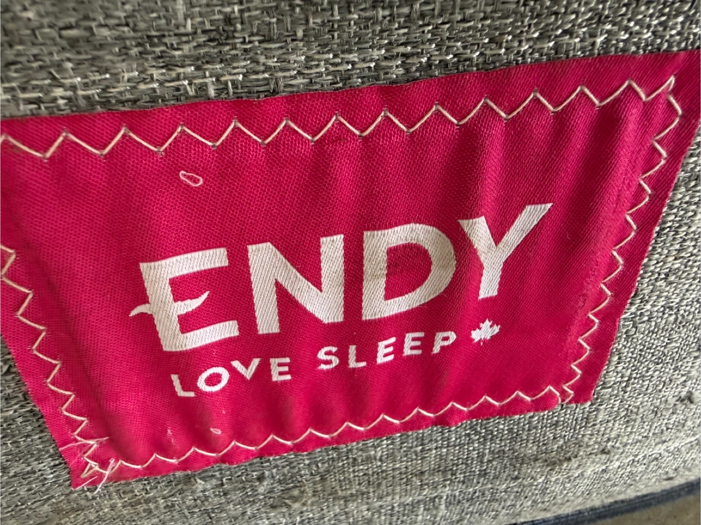 Comfortable ENDY mattress. Grey fabric sides and white quilted top. This mattress measures approximately 10 inches thick. Box spring available for extra cost pickup or delivery available for extra $$