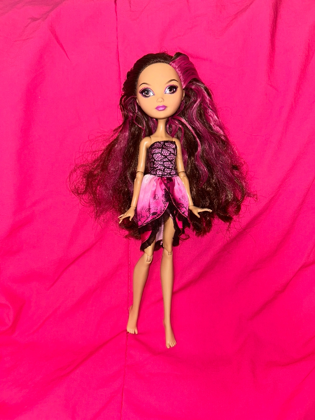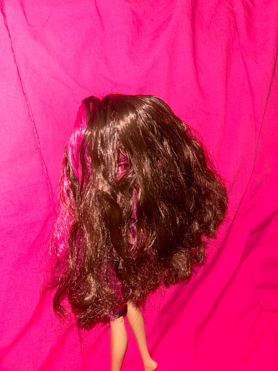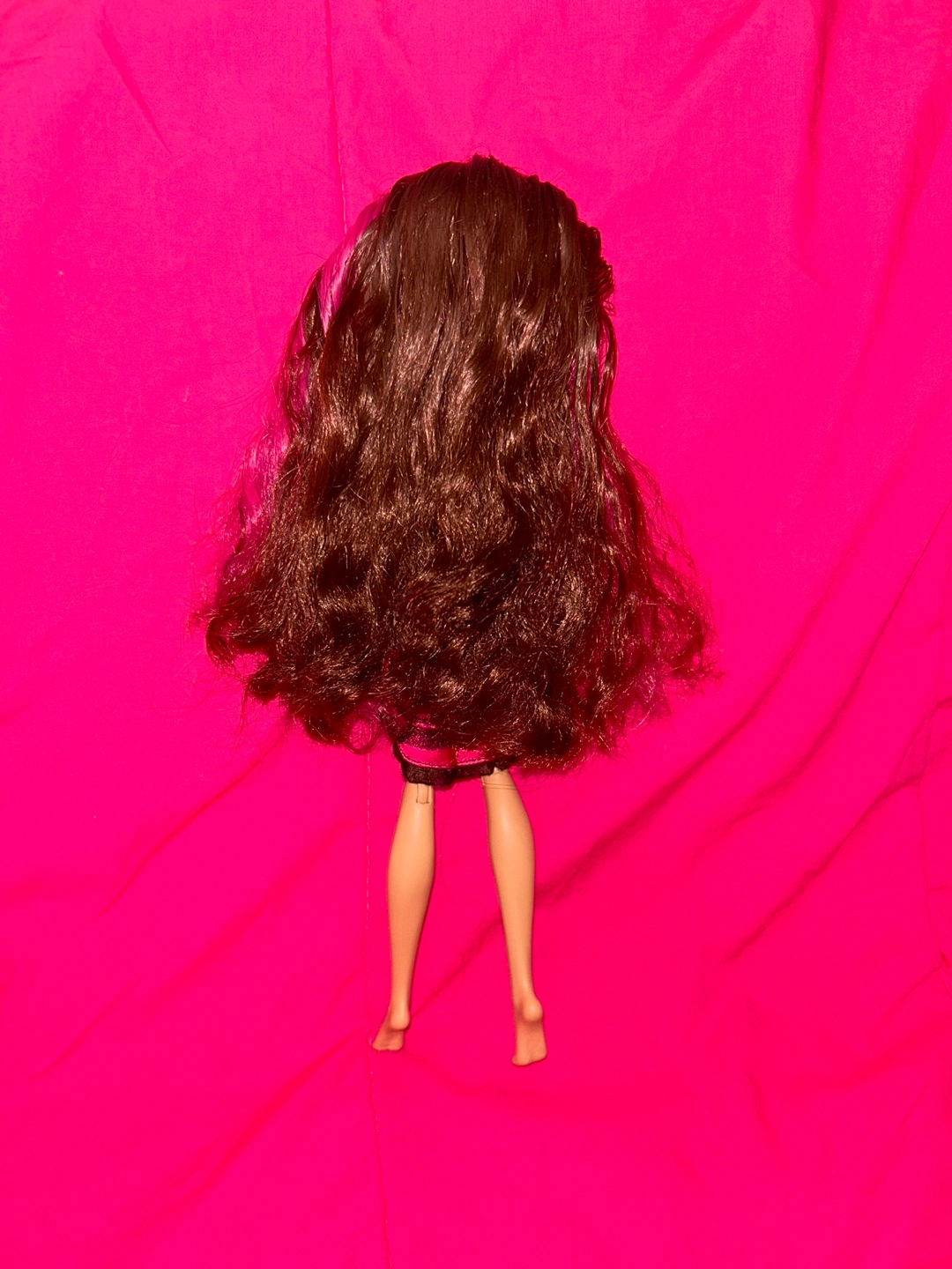 Doesn’t come with shoes, comes with her original dress. Her screening is good with no visible flaws however her hair has that glue residue that’s typical of these dolls.