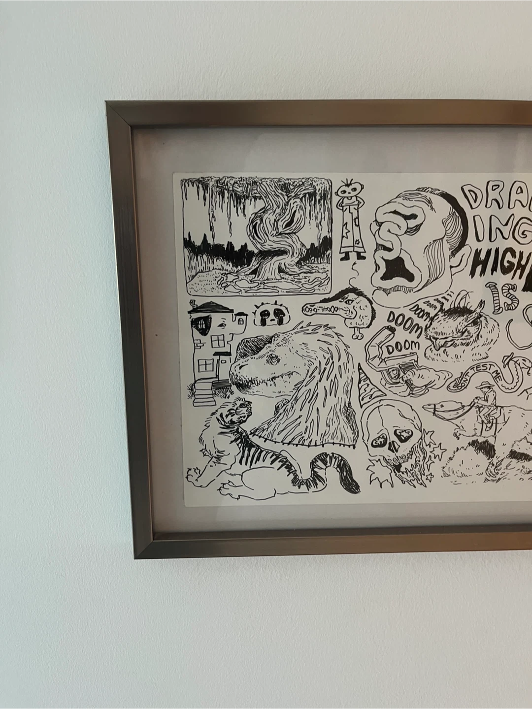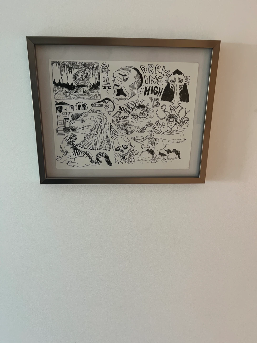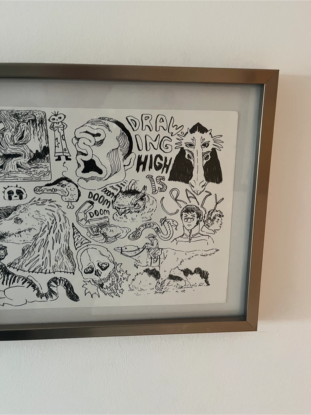 Framed black and white doodle art featuring various creatures and text. The art is behind glass in a silver-toned frame. It's a unique piece for wall decor.