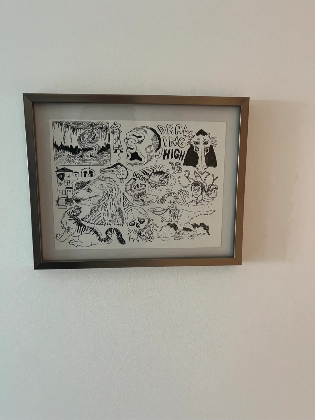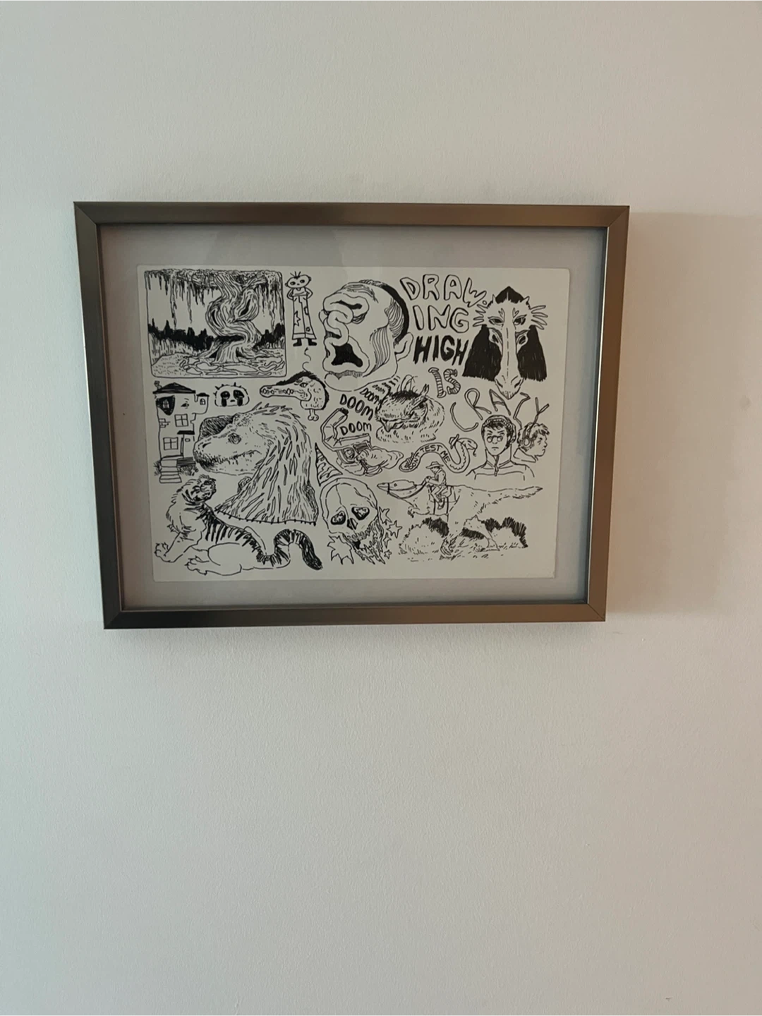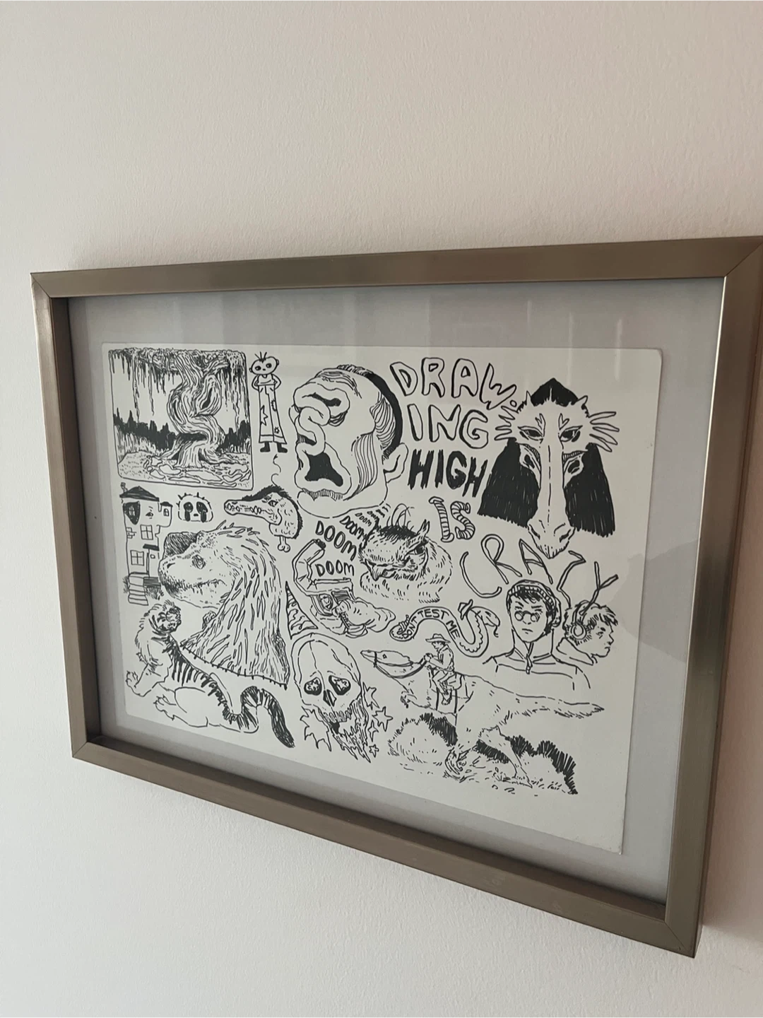 Framed black and white doodle art featuring various creatures and text. The art is behind glass in a silver-toned frame. It's a unique piece for wall decor.