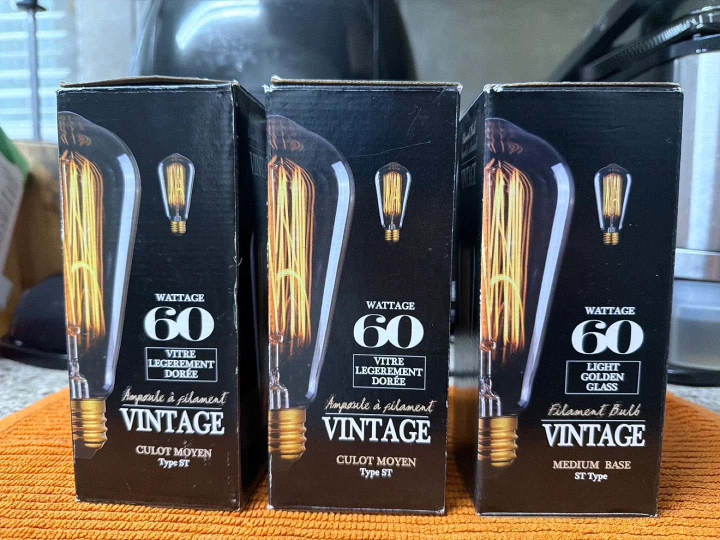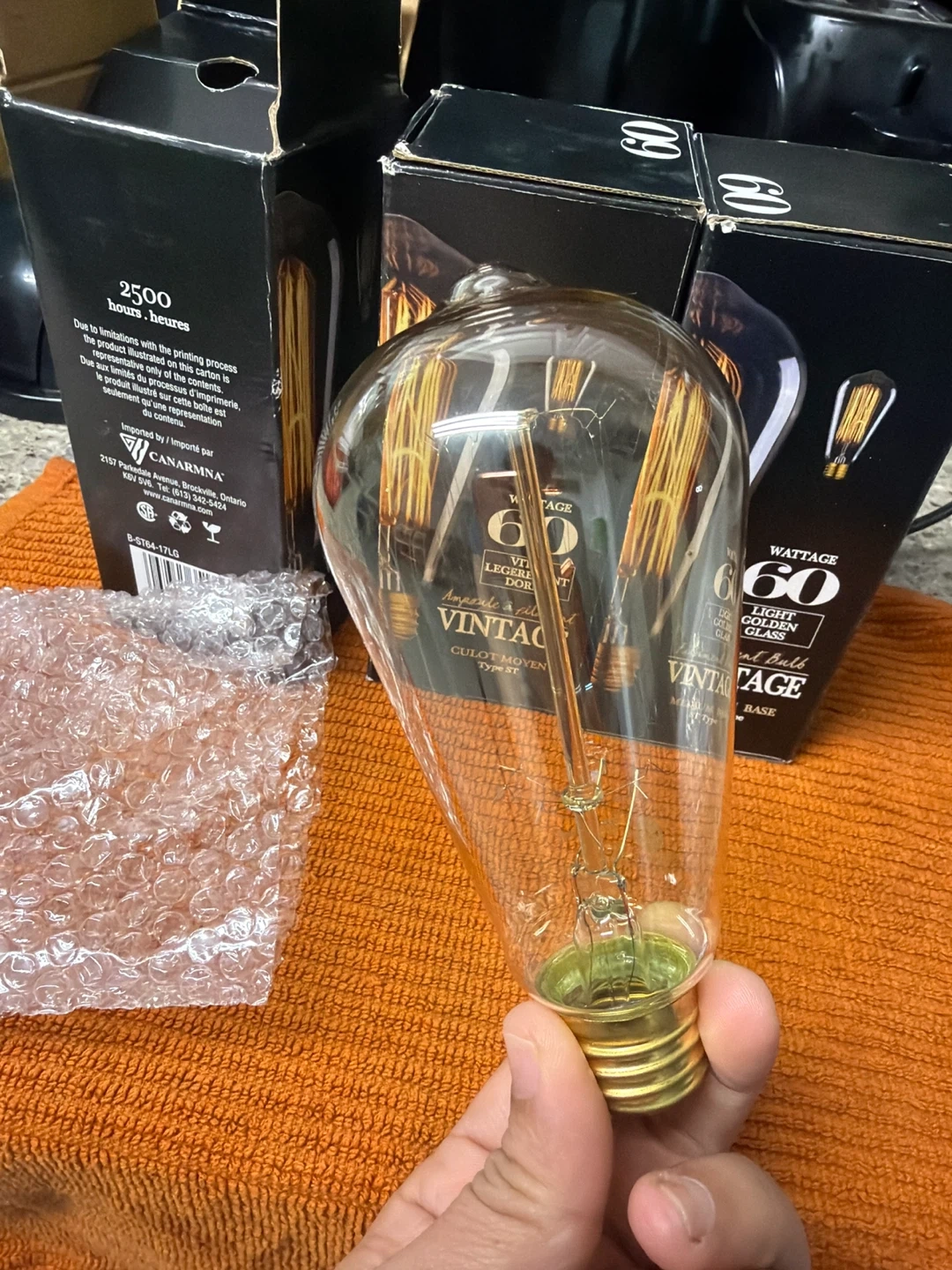 Three CANARNA vintage filament light bulbs. Each bulb is 60 watts with a light golden glass finish. They feature a medium base, ST type.