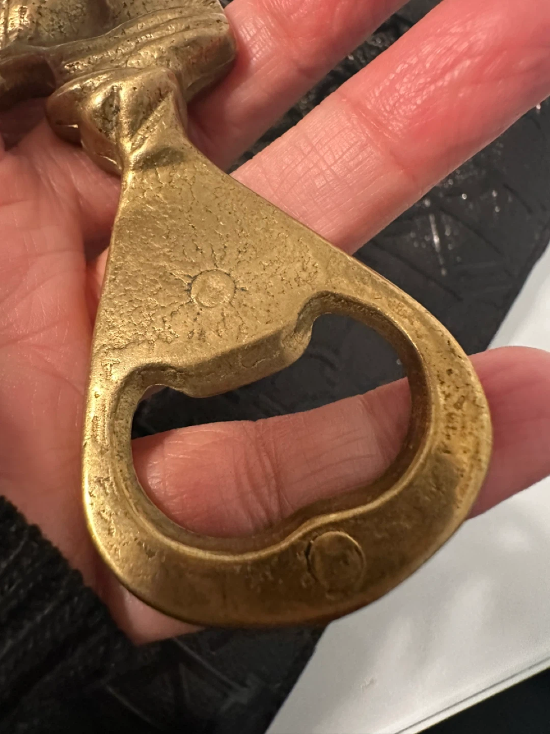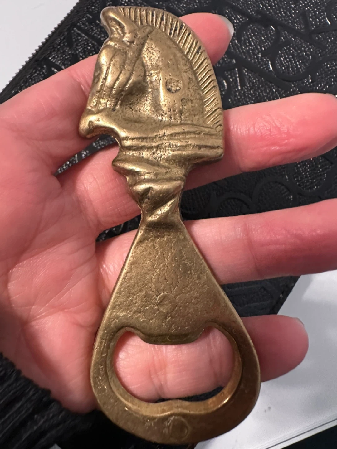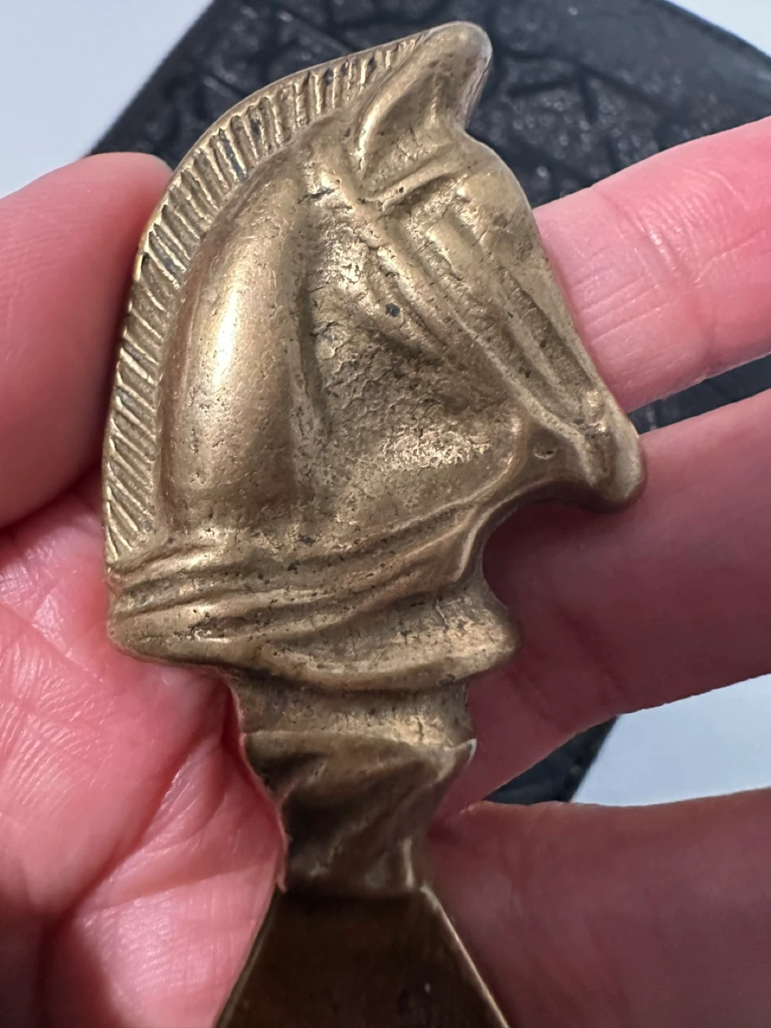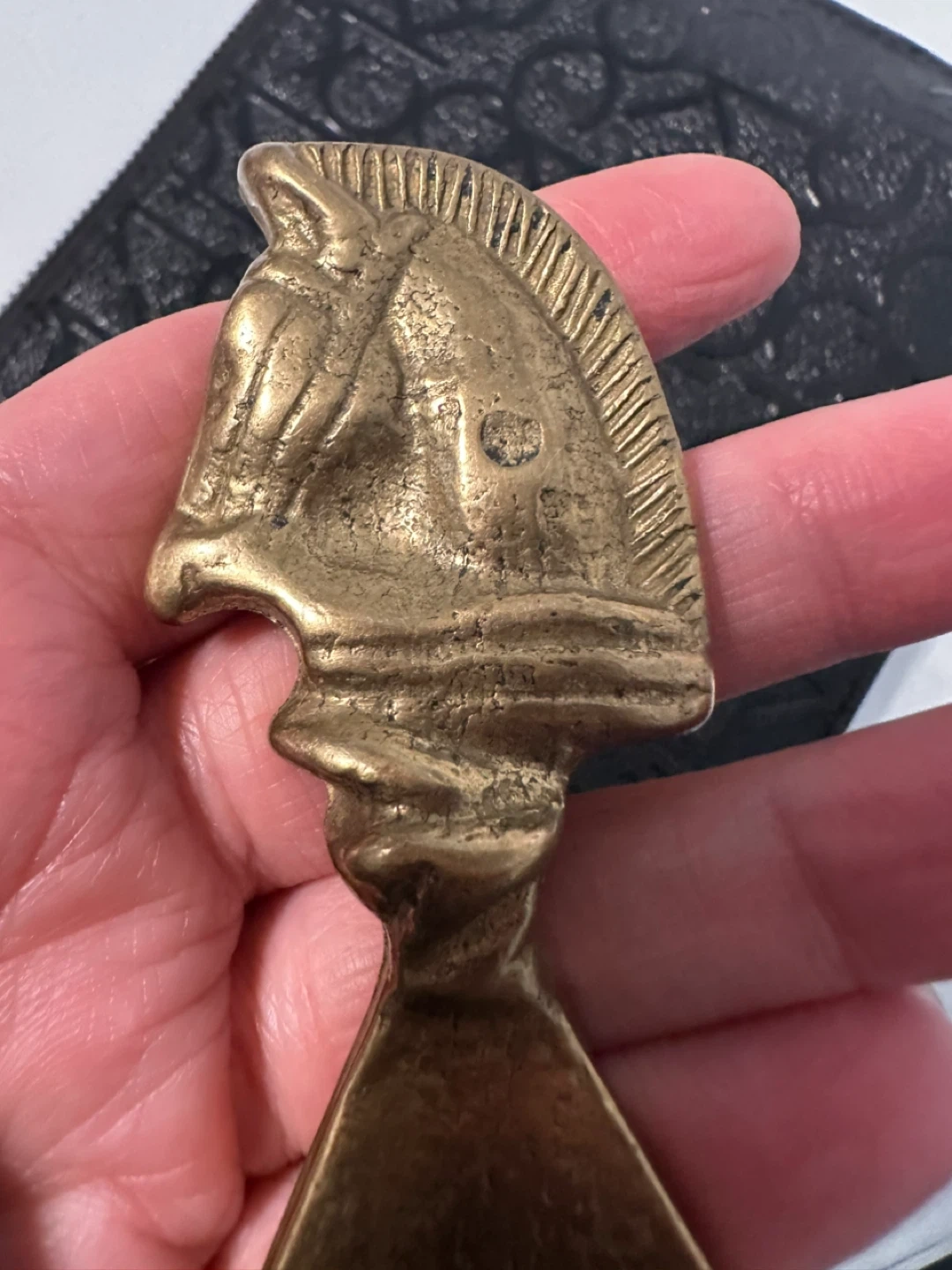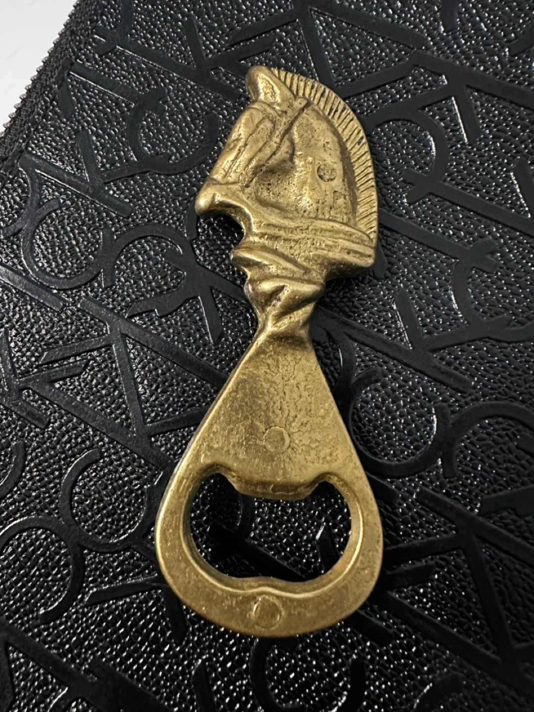 This brass bottle opener features a detailed knight's head design. It's made of solid brass and has a vintage aesthetic. A fun tool for opening beverages!