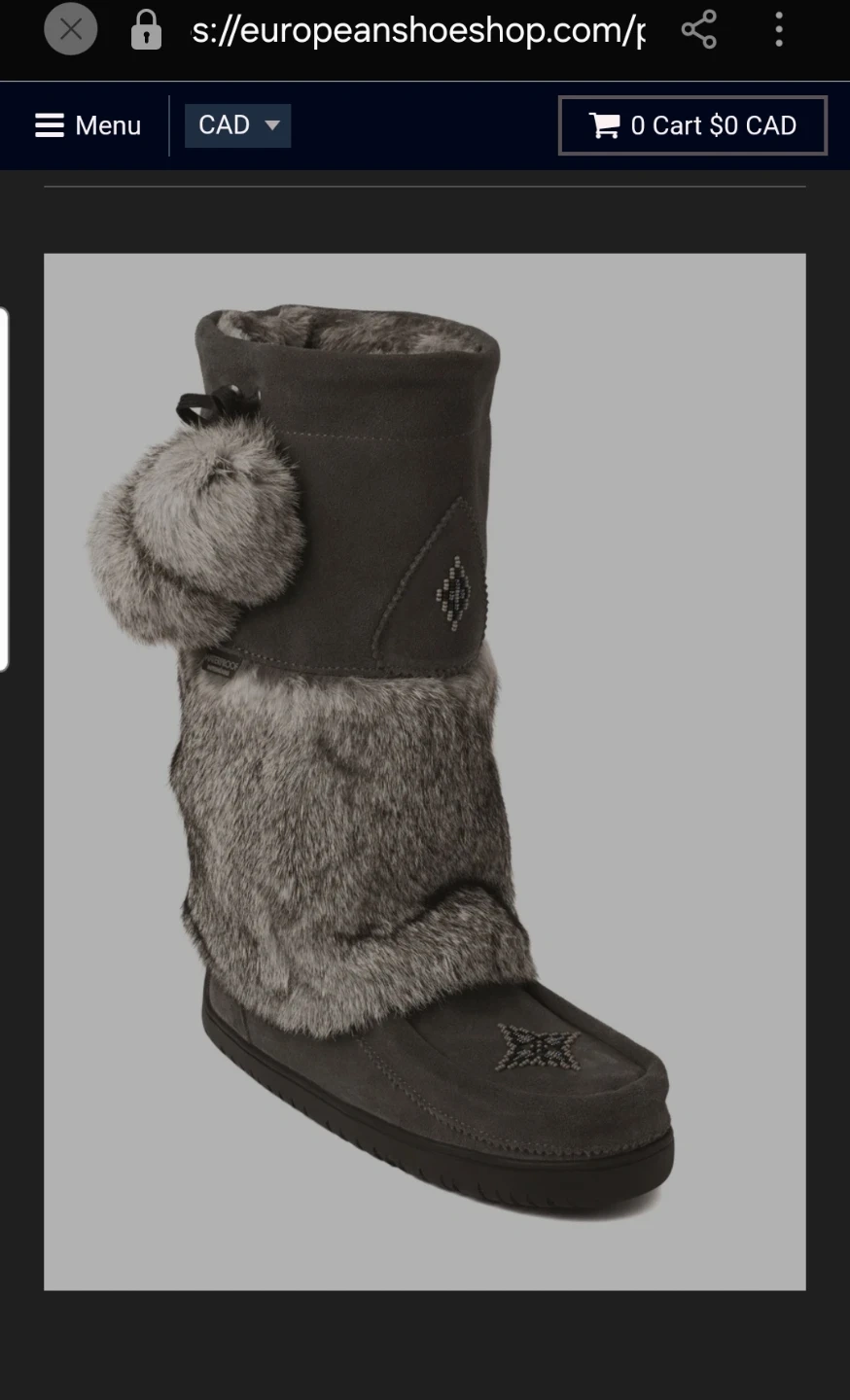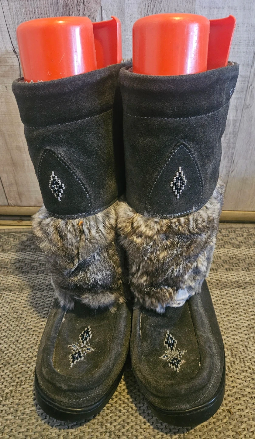 Stylish Manitobah Mukluks Women's Waterproof Snowy Owl mukluk boots in grey suede with rabbit fur trim. Perfect for winter fashion.