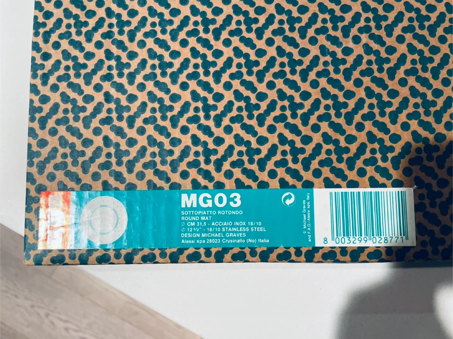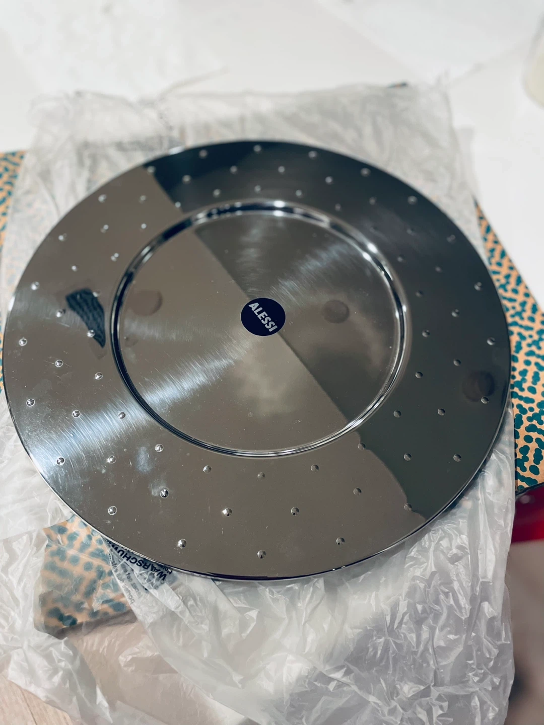 This is a collectable Alessi MG03 round tray. It's made of 18/10 stainless steel. Designed by Michael Graves. It's 31.5 cm in diameter.