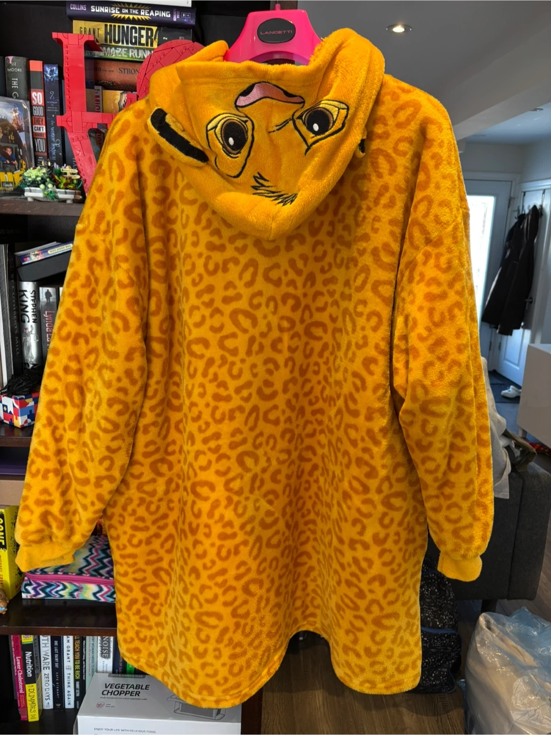 Stay cozy in this "The Lion King" sherpa hoodie blanket. It's super soft and features a fun leopard print design. Made in China, size M/L.