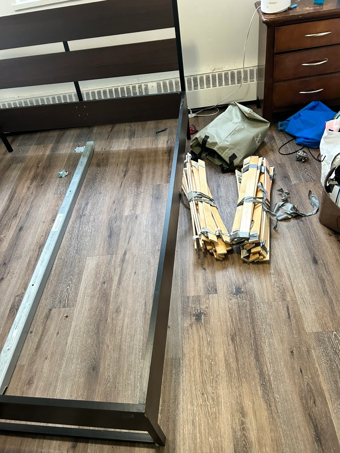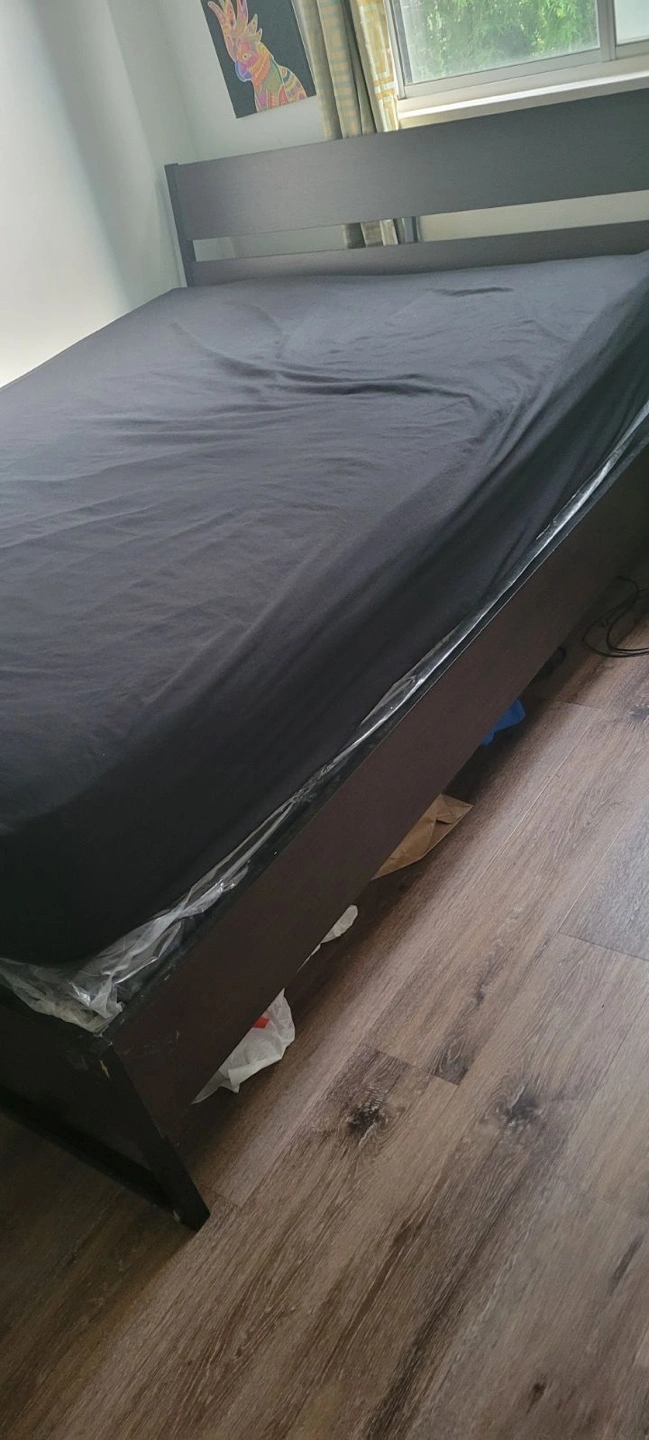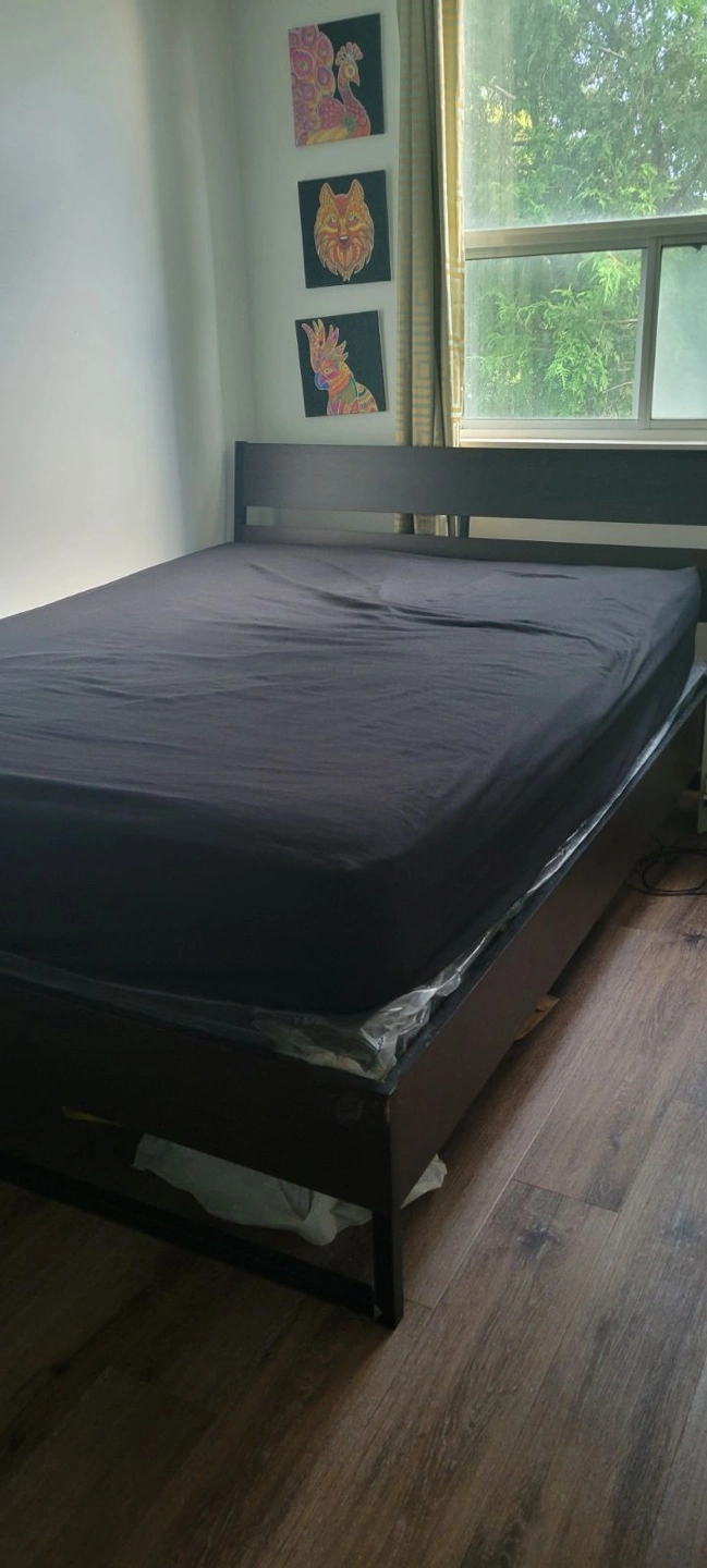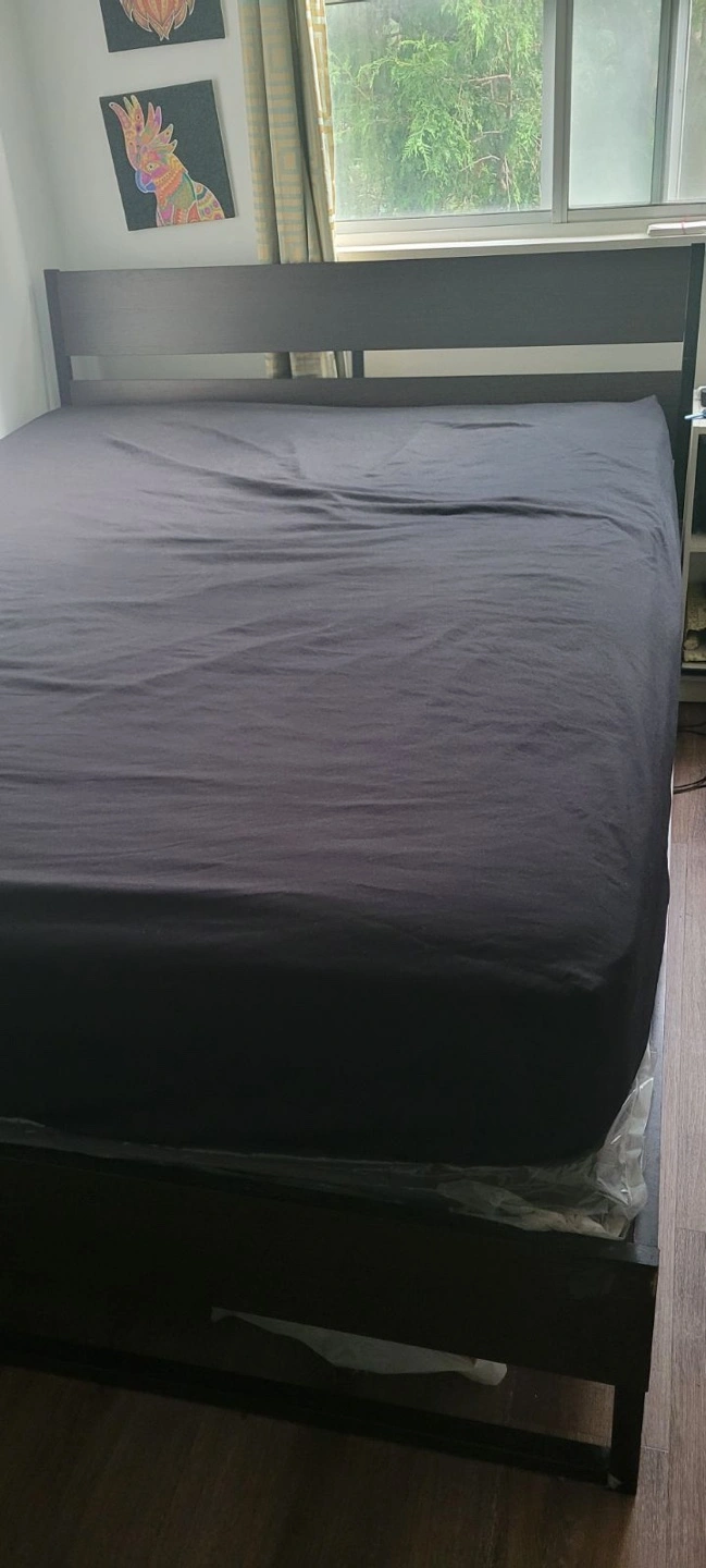 Queen-sized bed frame with headboard and footboard. Includes slats to support mattress. Retail price :499$ +60$ slats +taxes
