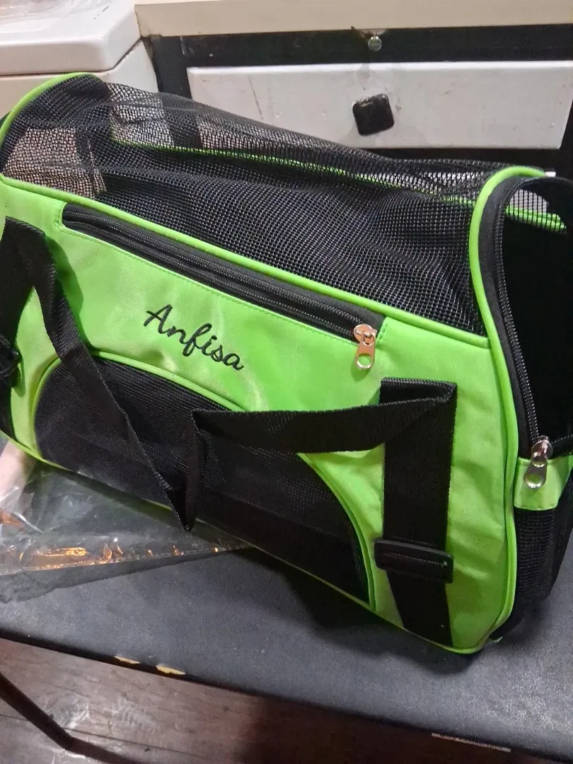 Lime green pet carrier bag with black mesh panels and handles. It features a zippered main compartment and an "Anfisa" embroidered name on the side. This carrier is designed for small pets and includes ventilation.