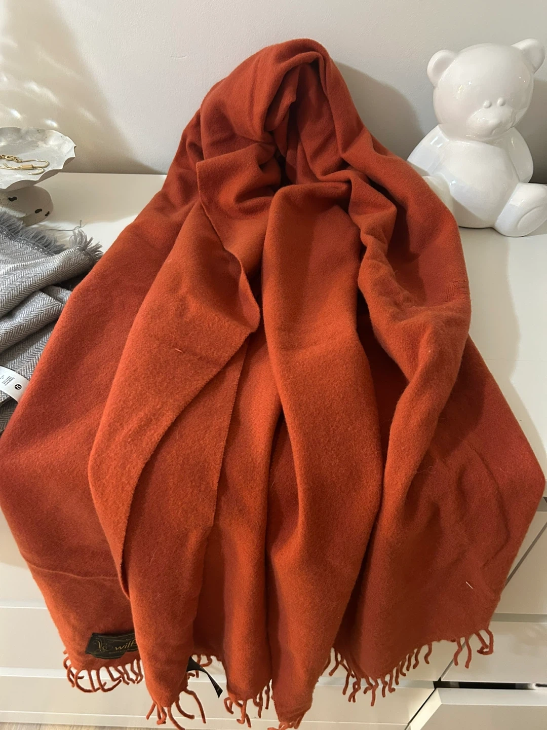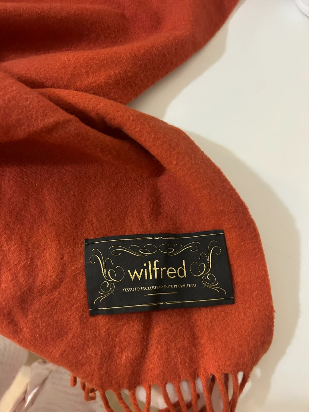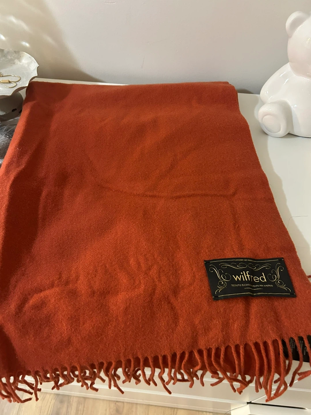 This Wilfred scarf is a lovely burnt orange colour. It's made from 100% wool and features fringed edges. Perfect for adding a cozy layer on cooler days!