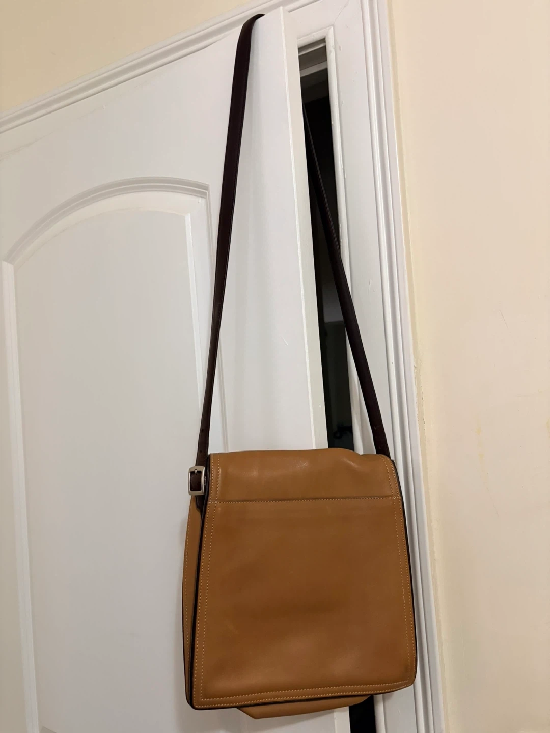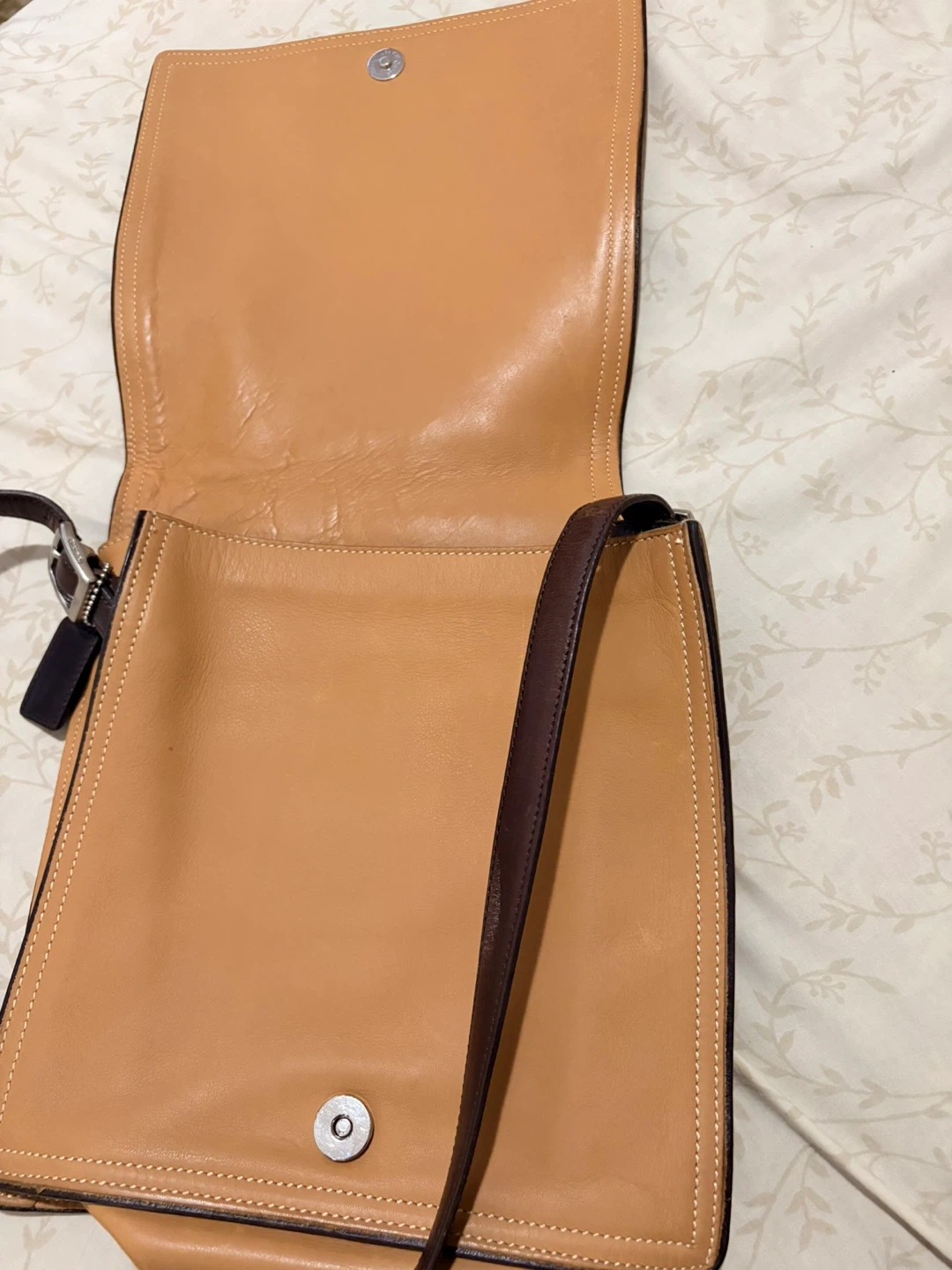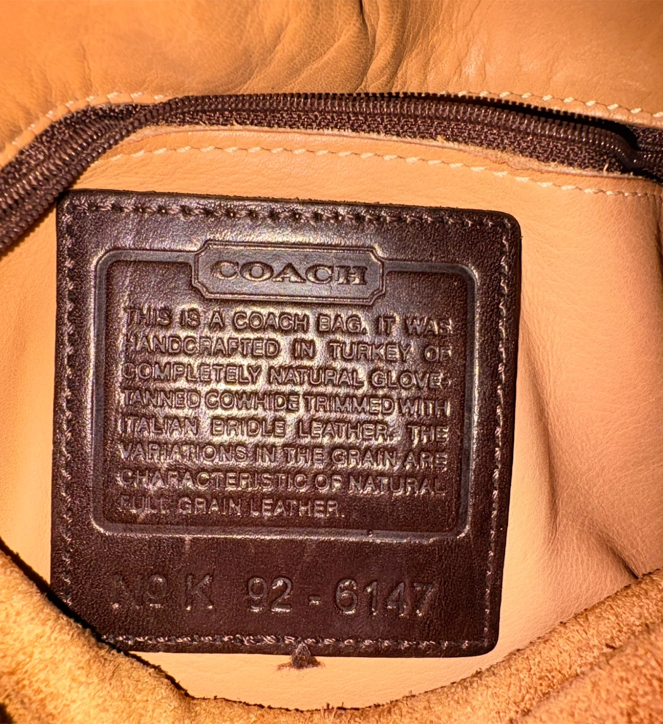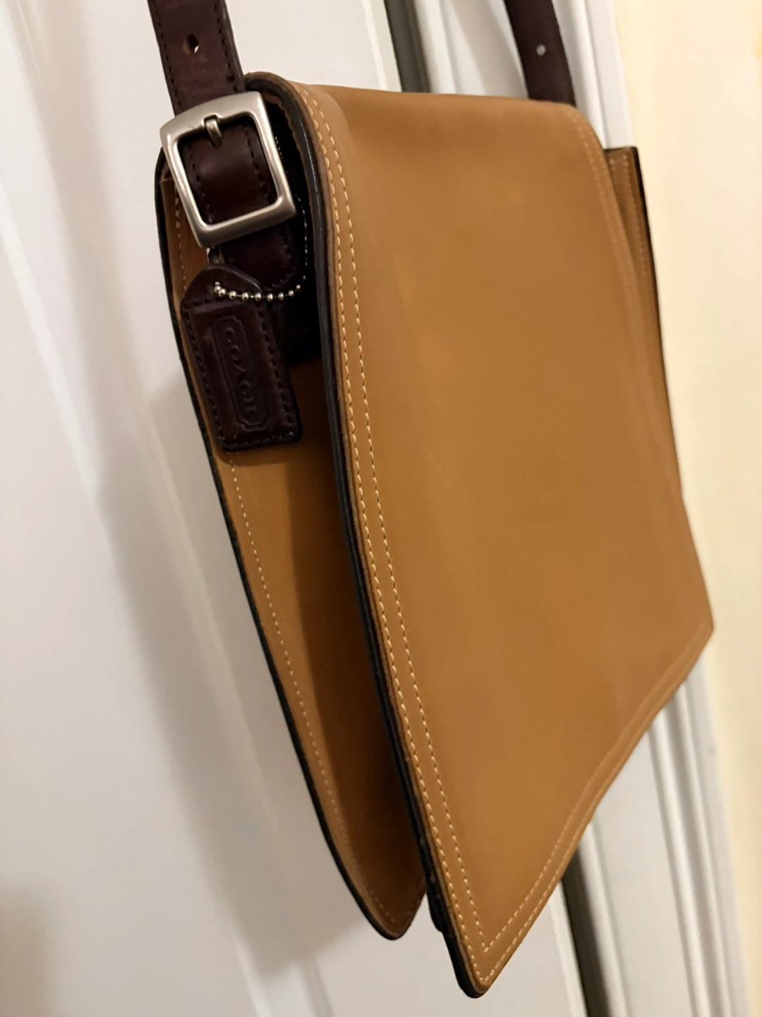 This is an authentic vintage Coach bag handcrafted in Turkey from Coach’s 1999 collection. This Legacy Monterey Flap bag (Style #6147) is handcrafted from premium, natural glove-tanned cowhide with Italian bridle leather trim. Classic structured messenger-style silhouette. In good used-vintage condition with two pen marks on the side of the bag and minor stains inside that can easily be cleaned. See pics