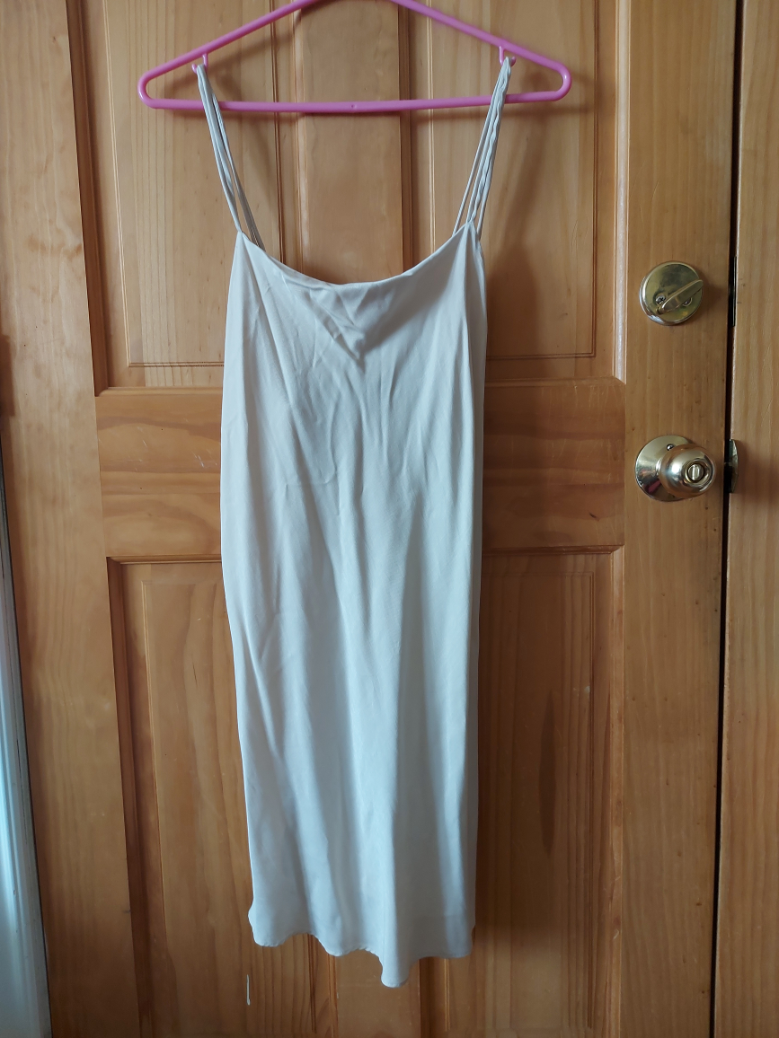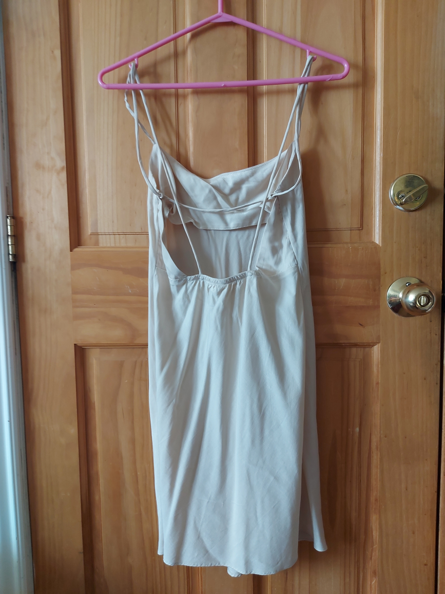 1000+MAKE AN OFFER! The brand name says it all! Brand new, no tags. Purchased online and was too late returning it. Tried on, too big, has been laundered. Very cool back criss-crosses and strings across. See photos. Above knee. Cream. Poly-cotton. Very slinky. Great find! Available for pick-up near Oakwood Village.