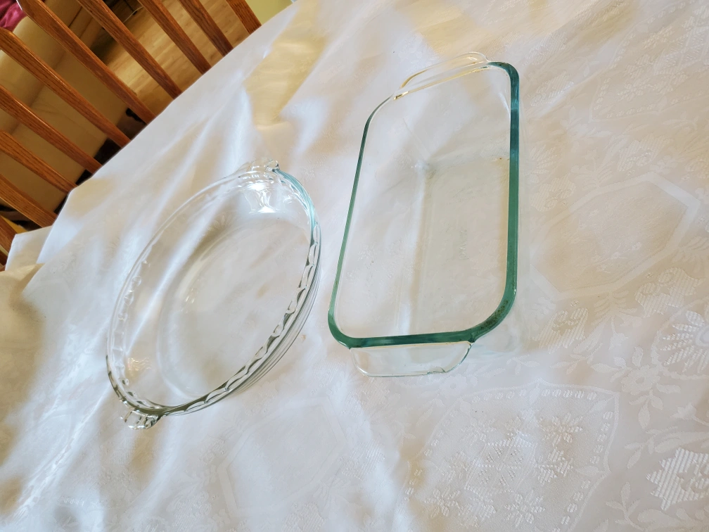 Two clear glass baking dishes for sale! One is oval-shaped, perfect for pies or casseroles, and the other is rectangular. Both are in good condition and ready for your next baking project