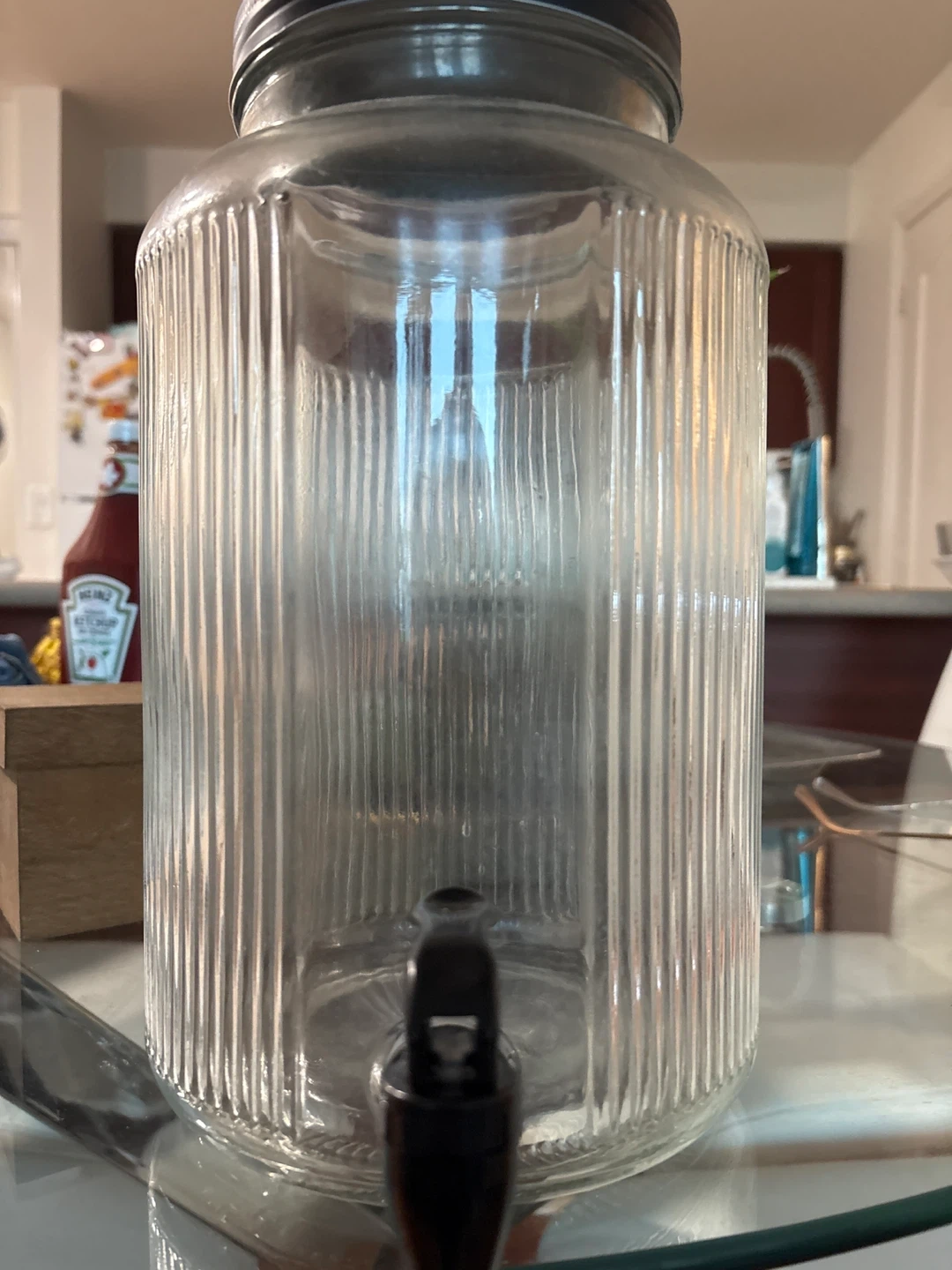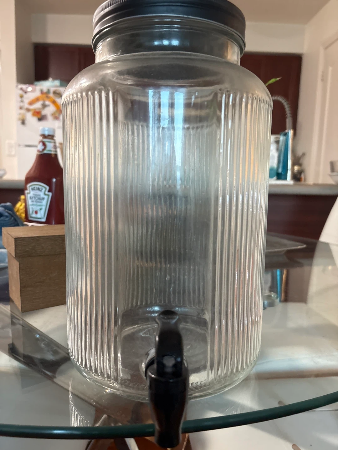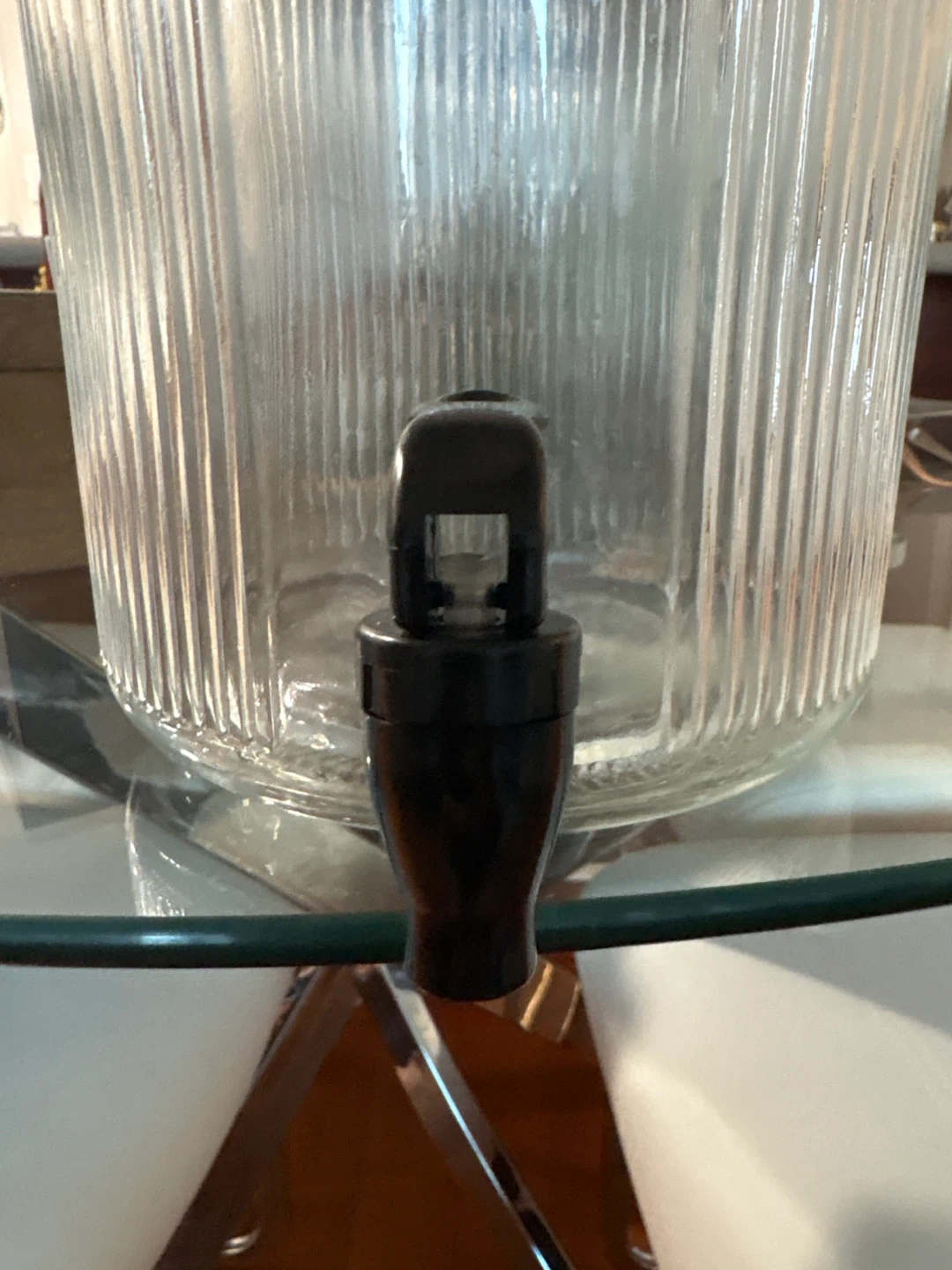 Selling a glass beverage dispenser with a spigot. It's in great shape and perfect for parties or everyday use. The ribbed design adds a nice touch!