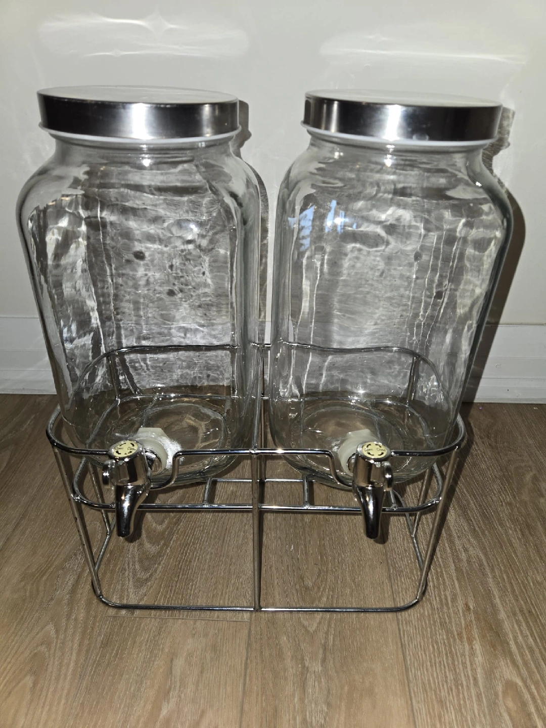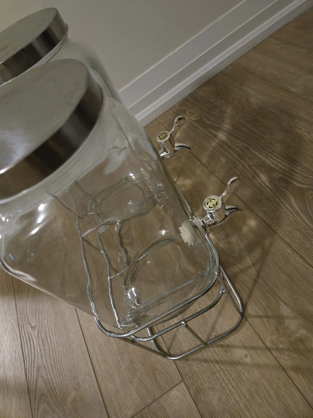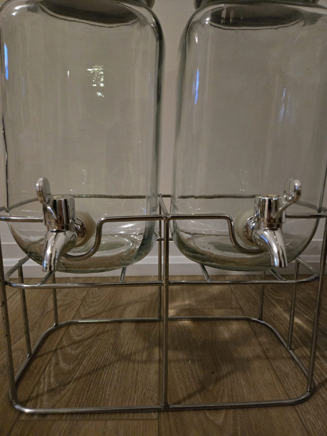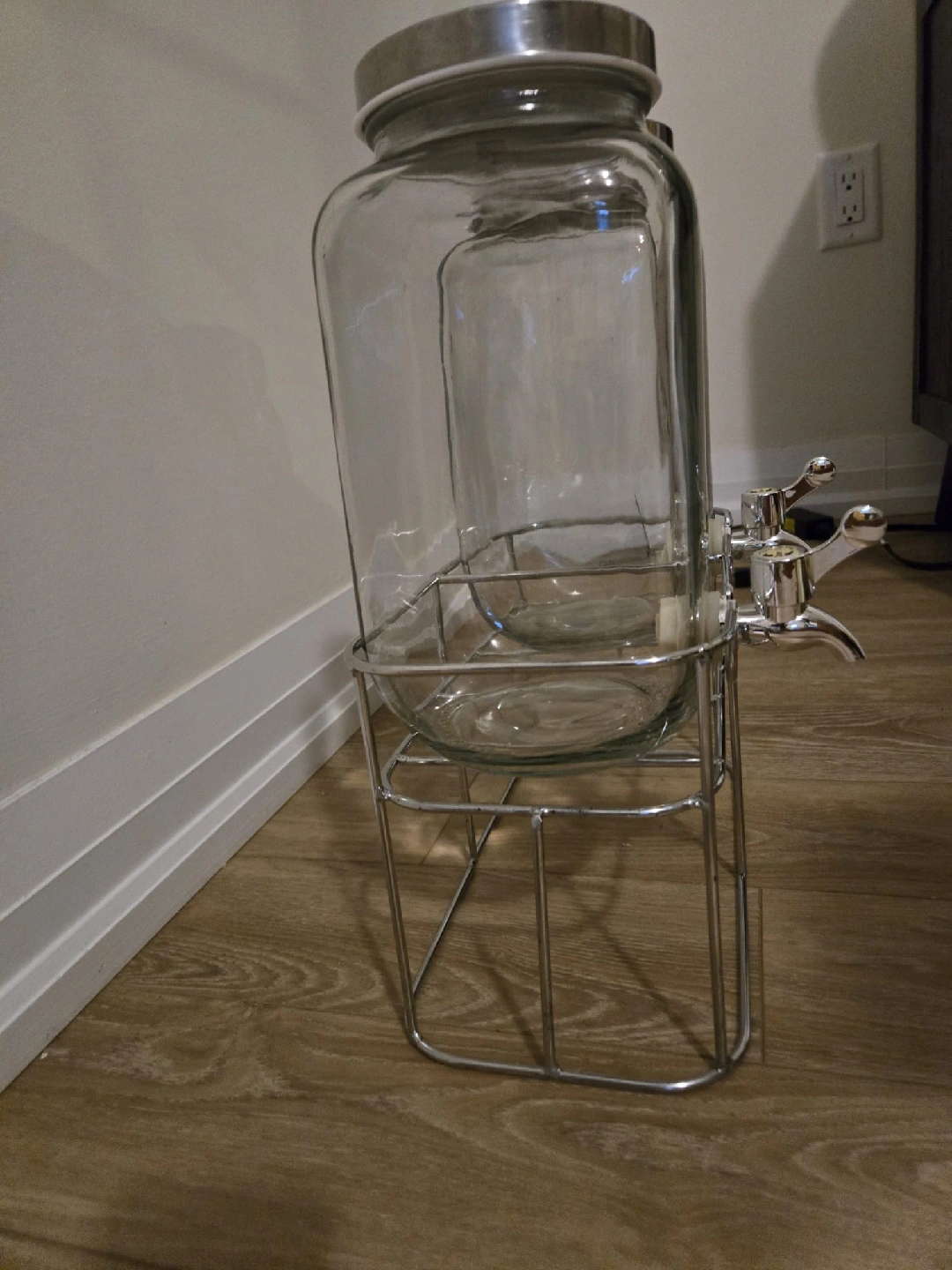 Selling a glass beverage dispenser with a metal stand. Perfect for parties or everyday use! It's in great condition and ready to use for your next gathering