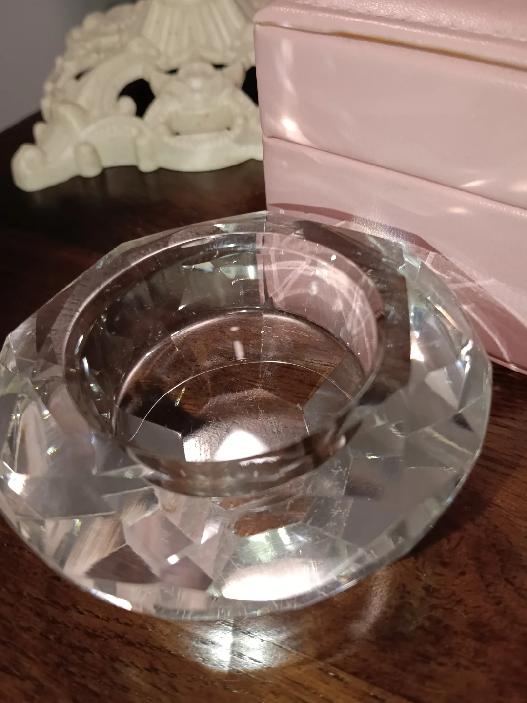 15Here's a beautiful glass candleholder, perfect for adding a touch of elegance to your space! It's in great condition and ready for a new home! Almost like Crystal! 🤩 Im open to discussing the price!