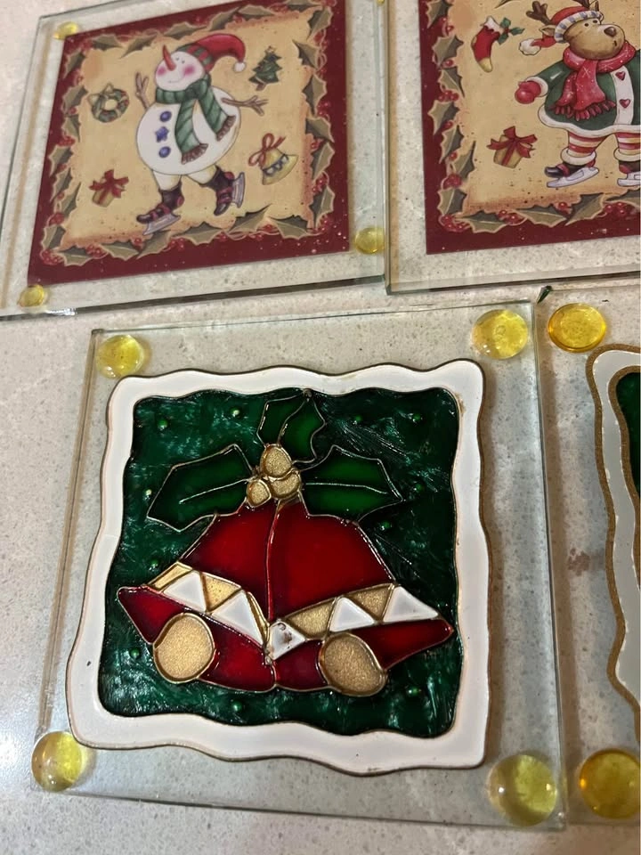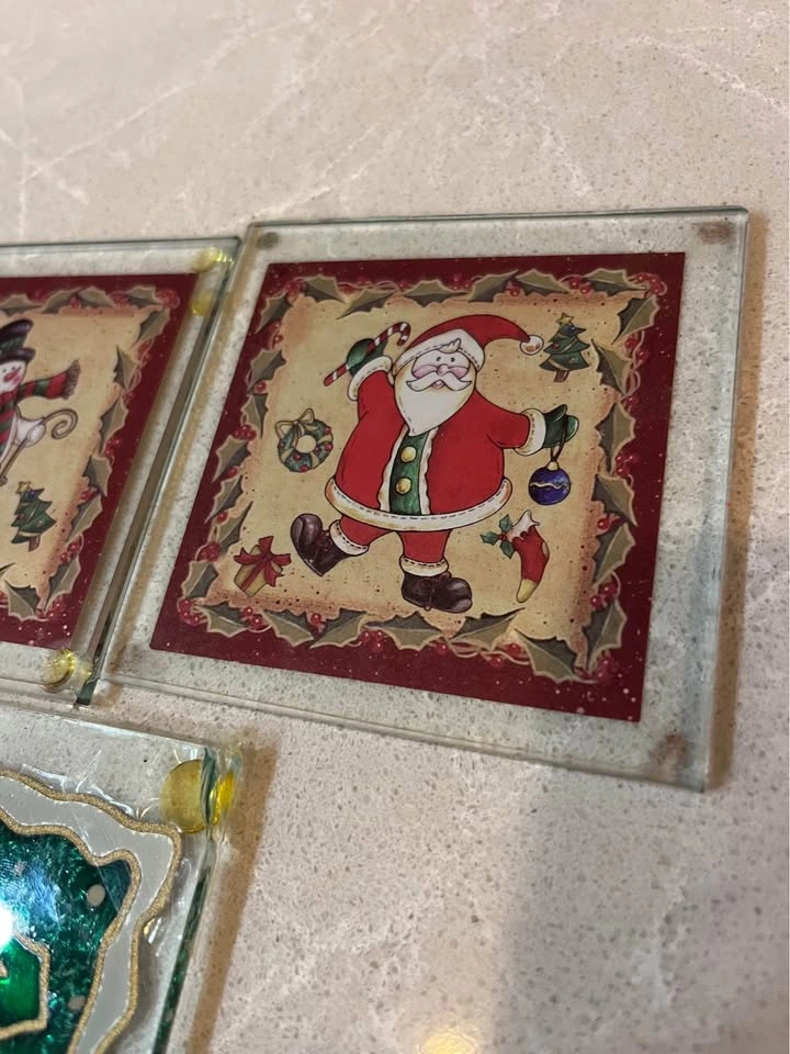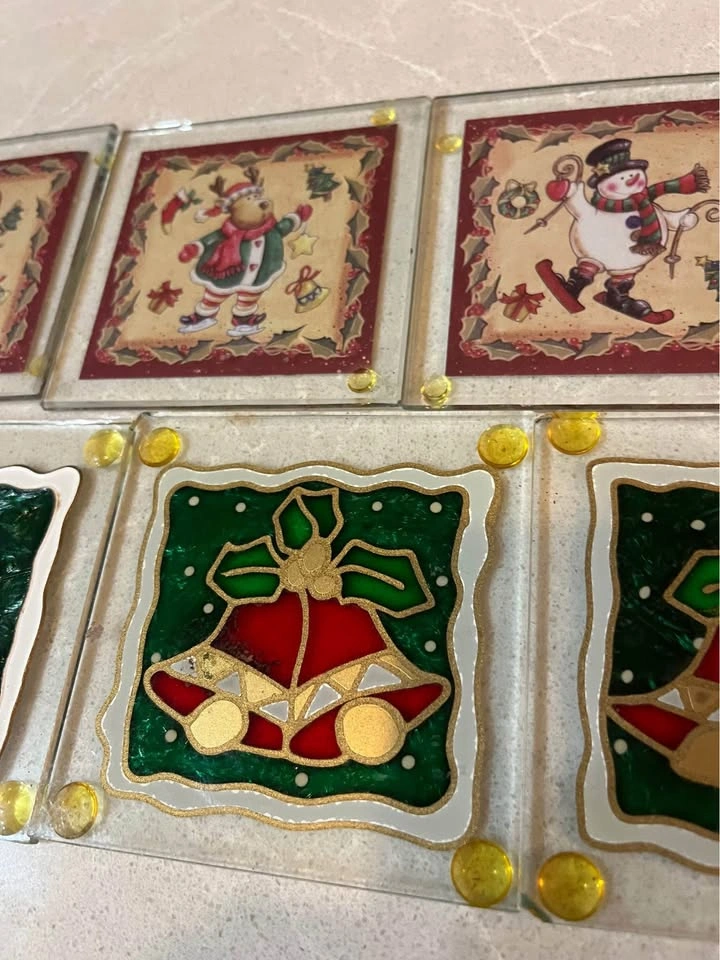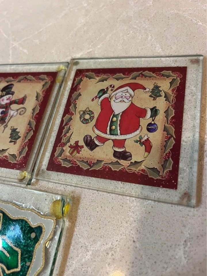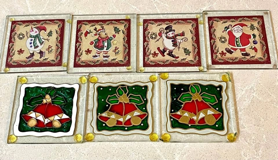Seven Christmas coasters about 3 1/2“ x 3 1/2“.