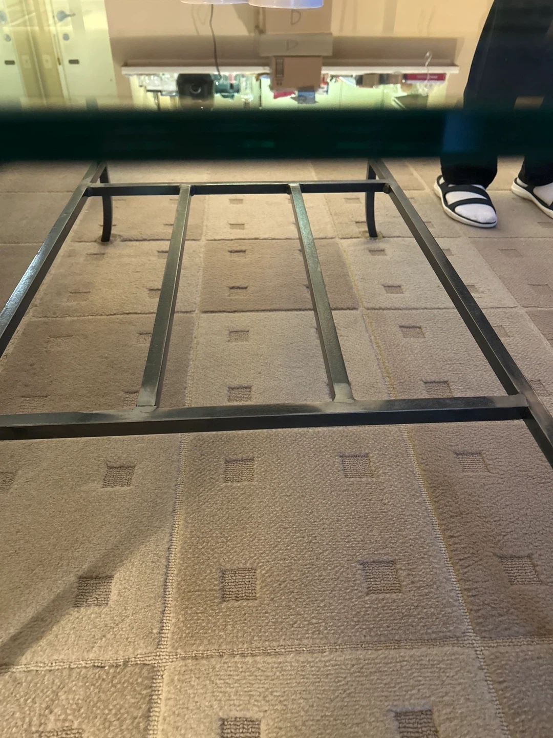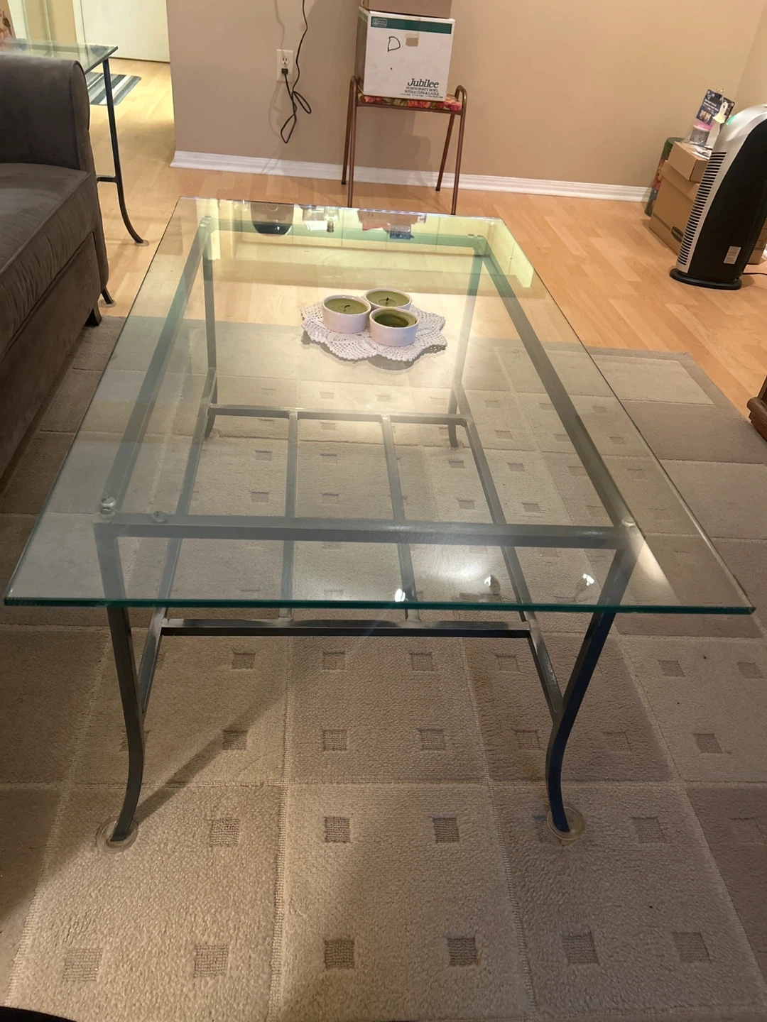 Selling a glass coffee table with a sturdy metal frame plus 2 matching end tables. It's a simple and elegant piece that would look great in any living room. The glass top is in good condition and easy to clean. The metal frame provides a stable base. It's a great addition to any home! End Table 20 x 29” x 22” H