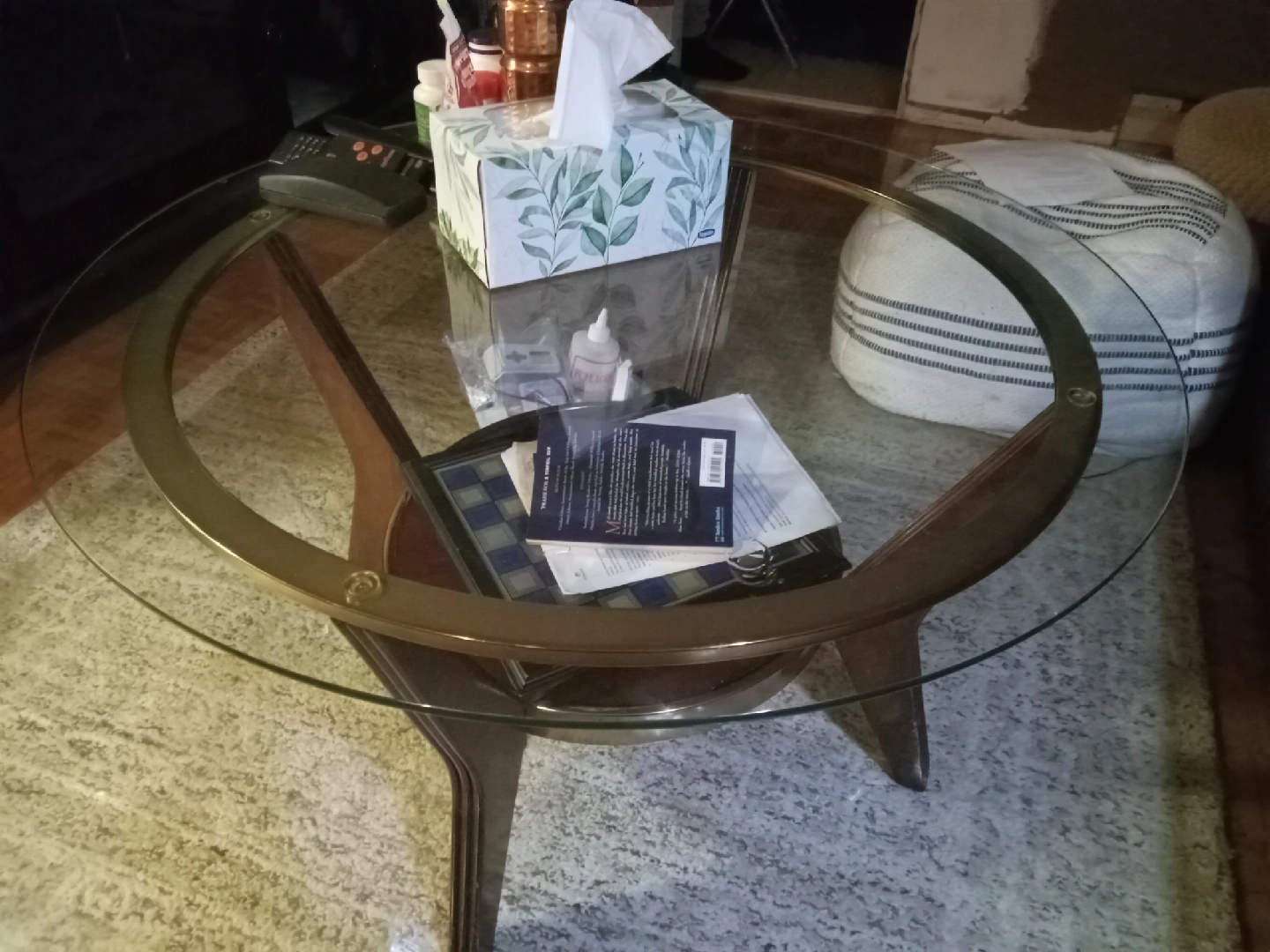 10One glass coffee table and glass side table with wooden legs.