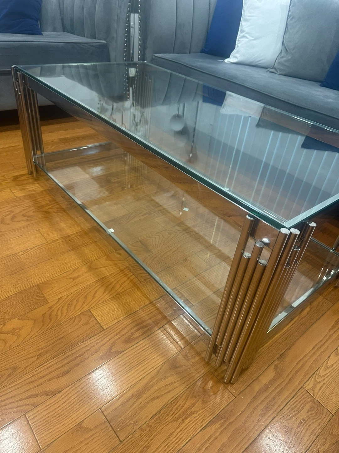 10Selling a stylish glass coffee table! It features a clear glass top and a lower shelf, perfect for displaying items or storing books and magazines. The chrome legs add a modern touch to any living room. It's in great condition and ready for a new home!